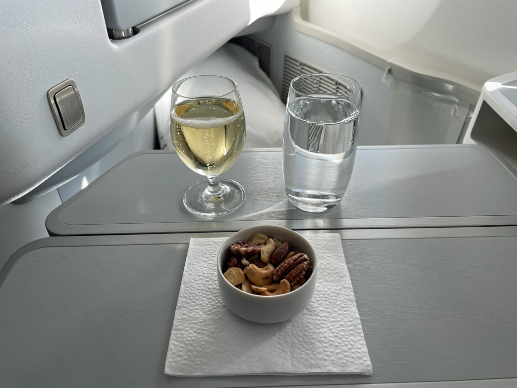 Ungefähr eine Stunde nach dem Start gab es eine erste Getränkerunde. Es gab Champagner, Sprudel und eine Schale mit Nüssen (ohne Erdnüsse, die ich jetzt einfach mal als Nuss ansehe). Allerdings lag die Serviette mit dem Eurowings Discover Logo falsch herum, so dass man das Logo nicht sehen konnte.