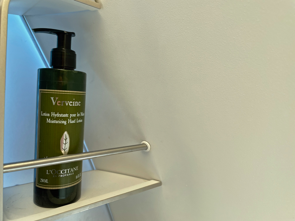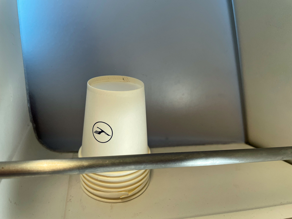 Für die Gäste der Business Class gibt es vorne in der Galley zwei Toiletten, eine links und eine rechts. Die Räume sind ein wenig größer als Toiletten in der Economy Class, laden aber nicht zum Verweilen ein. Als Amenities stehen Handcreme und Zahnputzbecher bereit. Diese stammen eindeutig aus Beständen der Lufthansa.