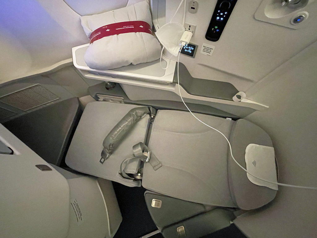 Als ich mich anschnallen wollte, fiel mir auf, dass der Anschnallgurt verdreht war, nicht an der richtigen Stelle aus dem Sitzpolster hervorkam und sich nicht eng anlegen ließ. Die herbeigerufene Perserin machte nur große Augen, schüttelte den Kopf und bat mich, schnell auf einem anderen Sitz Platz zu nehmen. Zum Glück gab es davon ein paar. Also zog ich von Platz 3L auf 2L um. Das ging so lange gut, bis ich schlafen wollte. Sitz 2L ließ sich nicht in Schlafposition bringen. Die Crew konnte das Problem mit dem Anschnallgurt an Sitz 3L zwischenzeitlich beheben, sodass ich wieder dorthin umziehen konnte.
