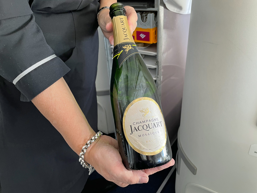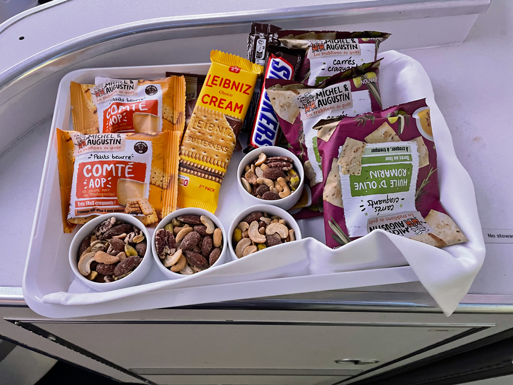 Die Crew stellte noch einen Snackkorb vor Sitz 1D auf. In der Galley konnte man sich Getränke holen.
