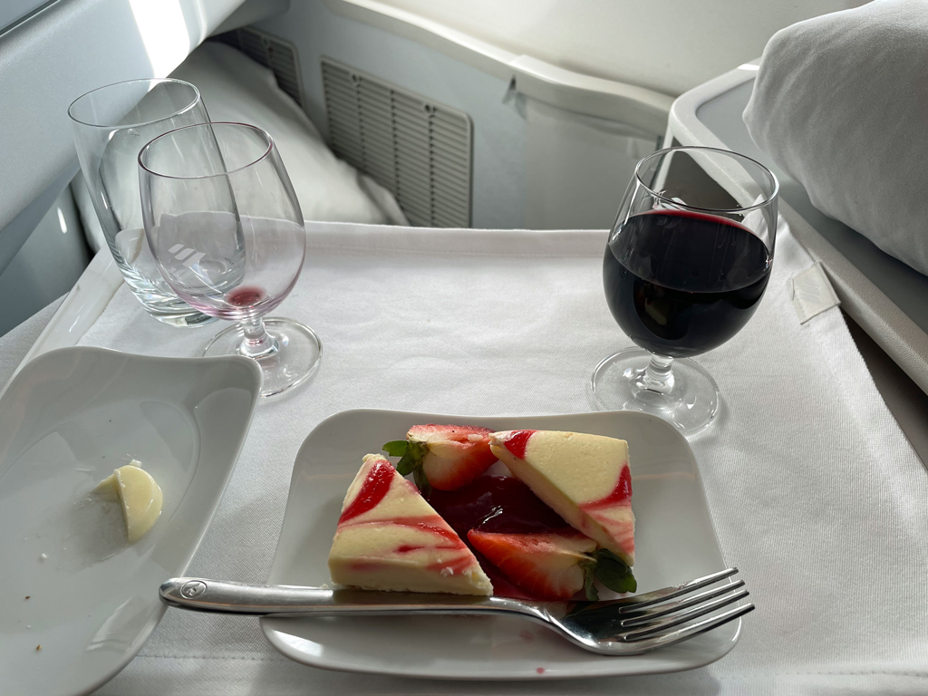 Ungefähr 25 Minuten später wurde die Vorspeise mit einem weiteren Getränkeservice angeboten. Die Vorspeise wurde nach ca. 20 Minuten abgeräumt. Nach zehn Minuten Pause folgte der Hauptgang. Und der blieb eine geschlagene Stunde am Platz stehen. Nicht, dass das Mahl so umfangreich gewesen wäre. Zwei Stunden nach dem ersten Getränkeservice wurde dann der Nachtisch gebracht. Die Crew gab uns ca. 30 Minuten, um diesen aufzuessen.