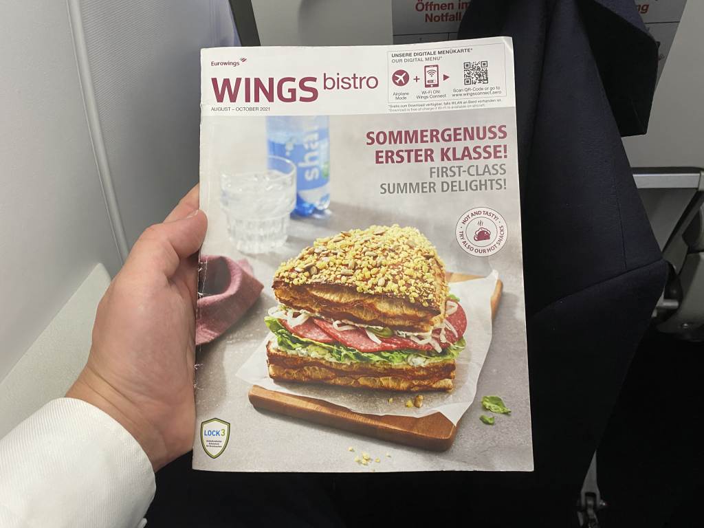 In der Eurowings Economy Class gibt es weder kostenlose Getränke, noch Snacks. Dafür ging die Crew kurz nach dem Start und einigen Vorbereitungen durch die Reihen und nahmen Bestellungen aus dem Wings Bistro auf. Das „Buy On Board“-Angebot von Eurowings bietet zahlreiche alkoholische und alkoholfreie Getränke, wie z.B. Hendricks Gin oder Jack Daniels Whiskey.