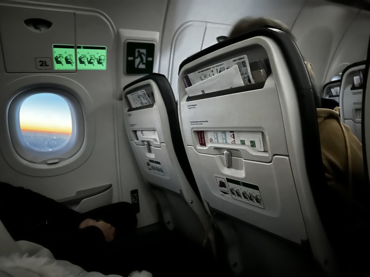Sonst sind es die unmöglich dünn gepolsterten Sitze, deren Rückenlehnen in der Economy Class nicht mehr verstellbar sind. Nicht nur am Notausgang fehlt die Funktion, genauso wie die Sitztaschen auf die man in der gesamten Kabine verzichtet hat.