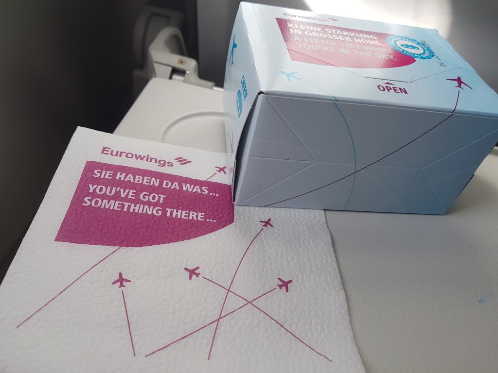 Während ich bei Lufthansa auf einer vergleichbaren Fluglänge einen Schokoriegel und ein Getränk erhalte und keine Möglichkeit nach etwas mehr besteht, so kann ich bei Eurowings meinen eventuellen Hunger gezielter bekämpfen.