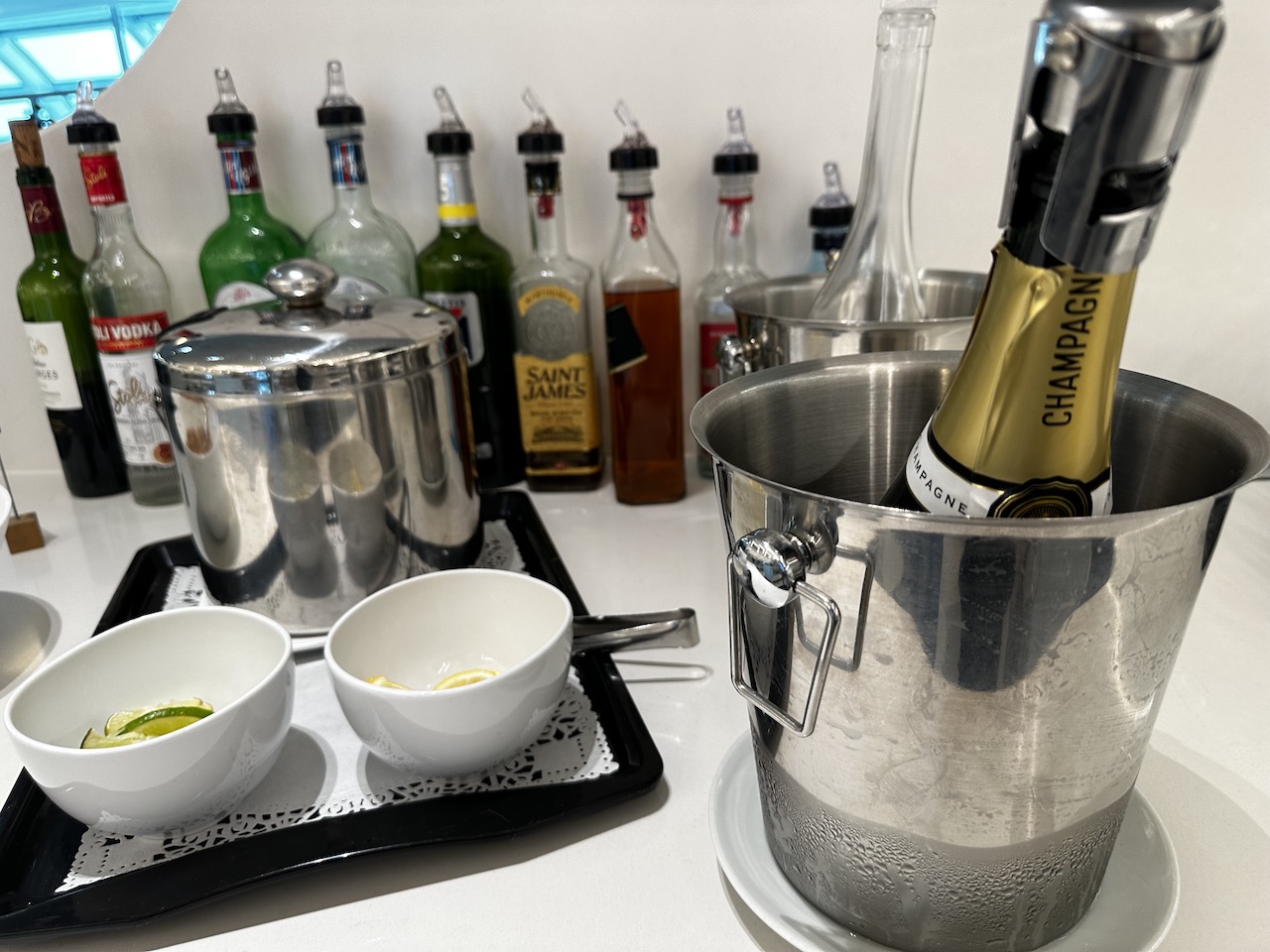 Zum Getränkesortiment gehören Softdrinks und Säfte sowie Heißgetränke. Es gab mehrere Weine, diverse Spirituosen und auch Champagner.