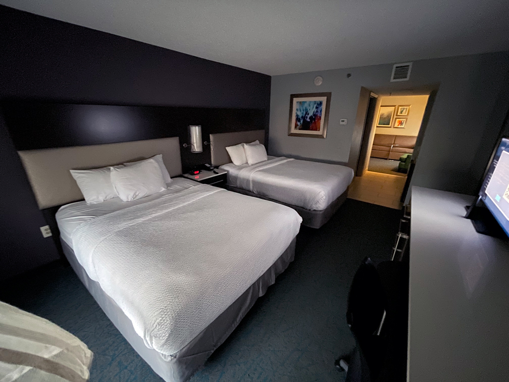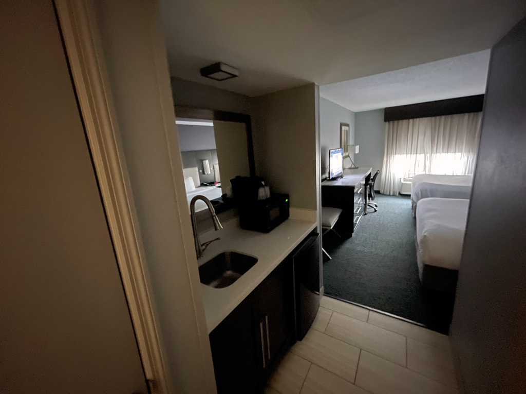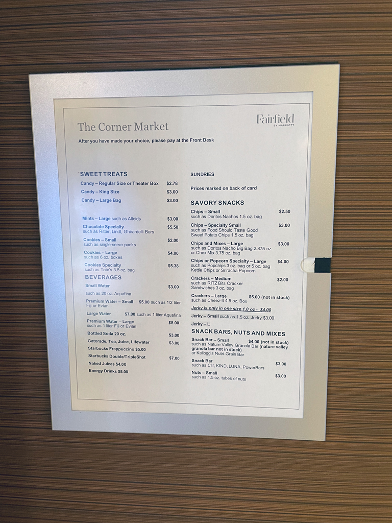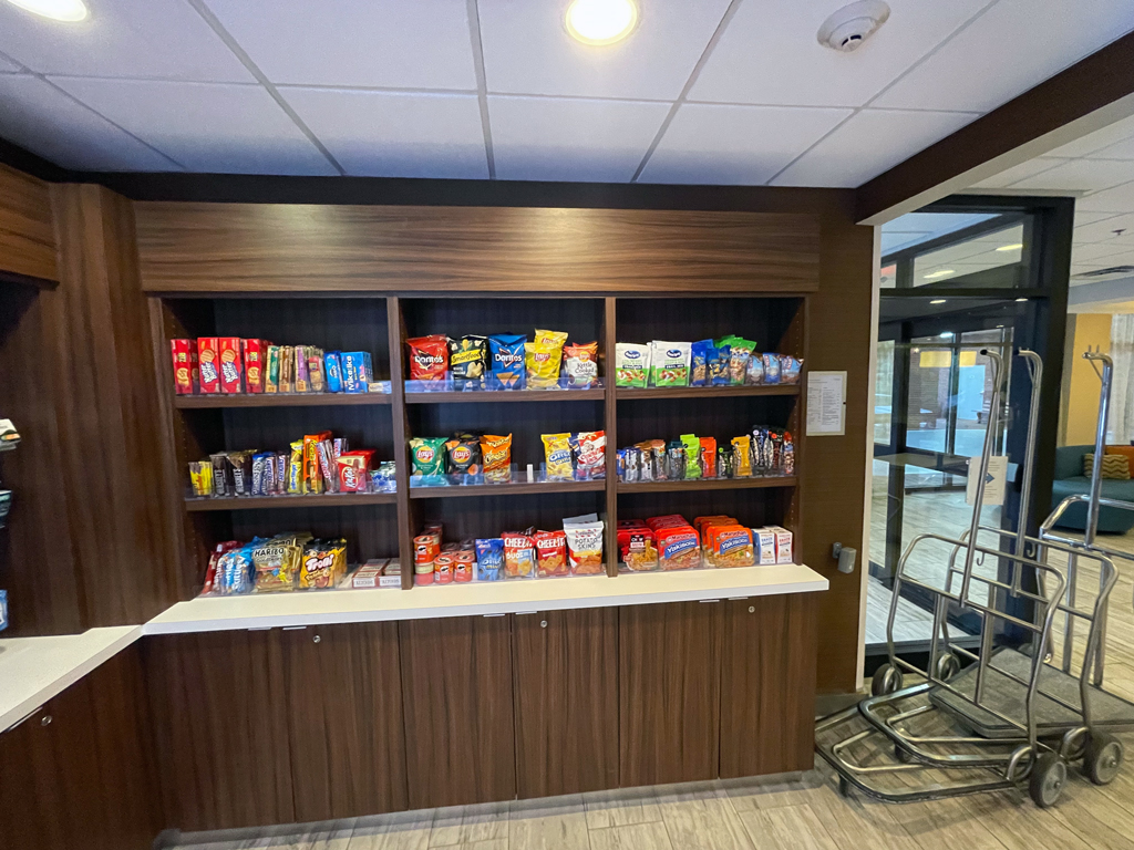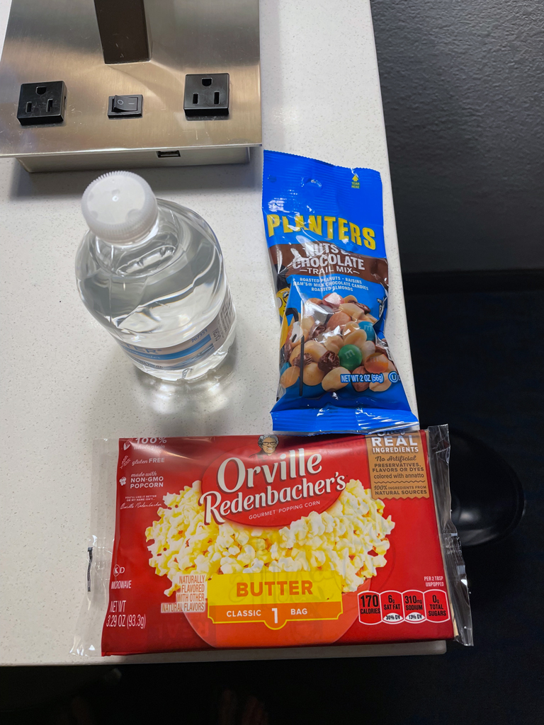Da Fairfield Inns „Limited Service” Hotels sind, sind die Statusvorteile auch nicht so stark ausgeprägt. So gibt es – abhängig vom Statuslevel – Bonuspunkte als Willkommensgeschenk und Zimmerupgrades nach Verfügbarkeit. Das Fairfield Inn Airport North hat im Wesentlichen drei Zimmerkategorien: Standardzimmer, Standardzimmer mit Blick zum Wald und Studios. Ich hatte ein Standardzimmer mit Blick zum Wald gebucht und erhielt mit meinem Platinumstatus ein Upgrade auf ein Studio. Darüber war ich einigermaßen überrascht, denn das Hotel nahm ab ca. einer Woche vor meinem Aufenthalt für diese Nacht keine neuen Reservierungen mehr entgegen. Ob es ausgebucht war oder an Personalmangel o.ä. lag, habe ich nicht in Erfahrung bringen können. Zum Check-in bekam ich eine Welcome Amenity Bag. Darin befanden sich eine kleine Flasche Wasser, einem Päckchen Studentenfutter und Mikrowellenpopcorn.