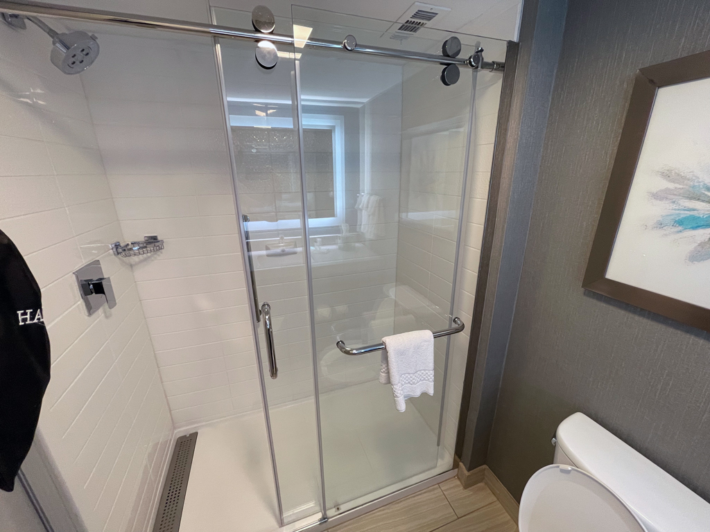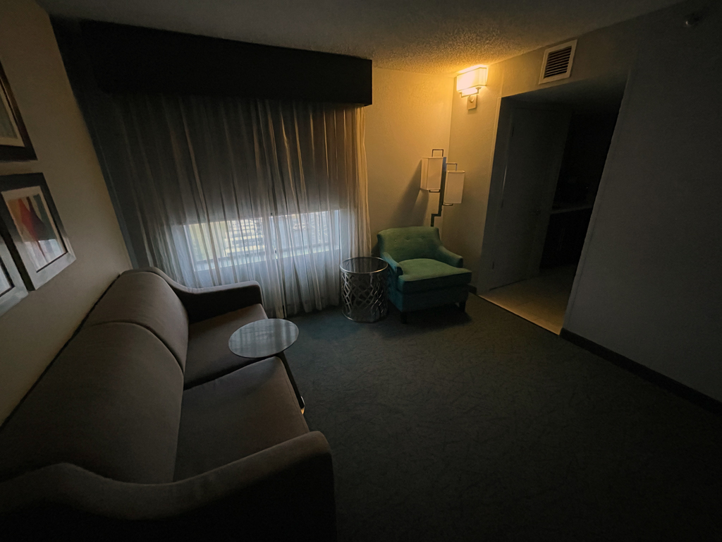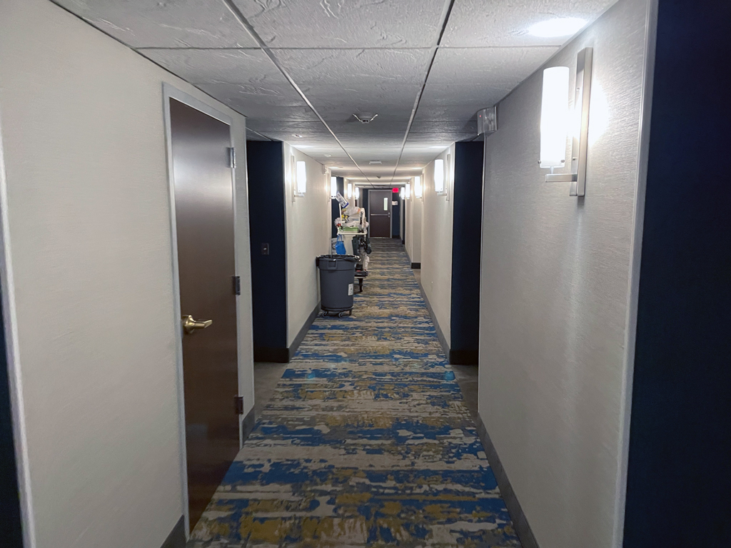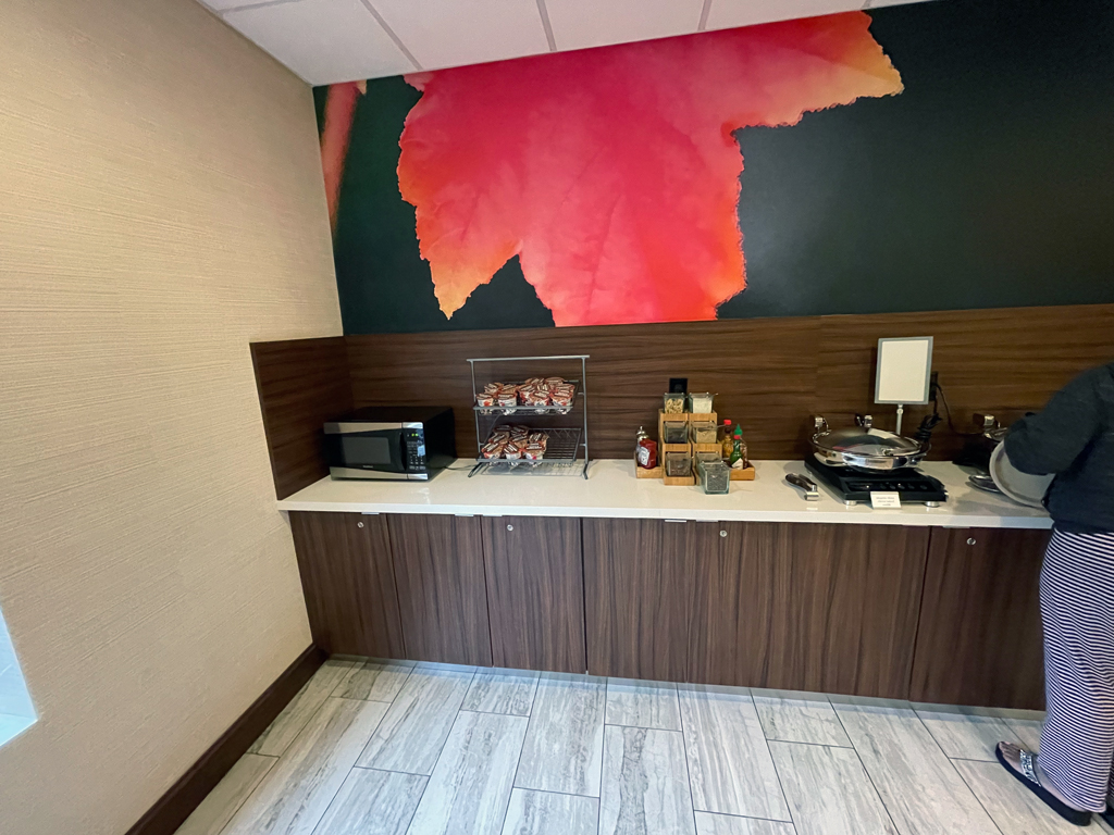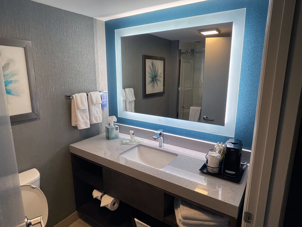 Da Fairfield Inns „Limited Service” Hotels sind, sind die Statusvorteile auch nicht so stark ausgeprägt. So gibt es – abhängig vom Statuslevel – Bonuspunkte als Willkommensgeschenk und Zimmerupgrades nach Verfügbarkeit. Das Fairfield Inn Airport North hat im Wesentlichen drei Zimmerkategorien: Standardzimmer, Standardzimmer mit Blick zum Wald und Studios. Ich hatte ein Standardzimmer mit Blick zum Wald gebucht und erhielt mit meinem Platinumstatus ein Upgrade auf ein Studio. Darüber war ich einigermaßen überrascht, denn das Hotel nahm ab ca. einer Woche vor meinem Aufenthalt für diese Nacht keine neuen Reservierungen mehr entgegen. Ob es ausgebucht war oder an Personalmangel o.ä. lag, habe ich nicht in Erfahrung bringen können. Zum Check-in bekam ich eine Welcome Amenity Bag. Darin befanden sich eine kleine Flasche Wasser, einem Päckchen Studentenfutter und Mikrowellenpopcorn.