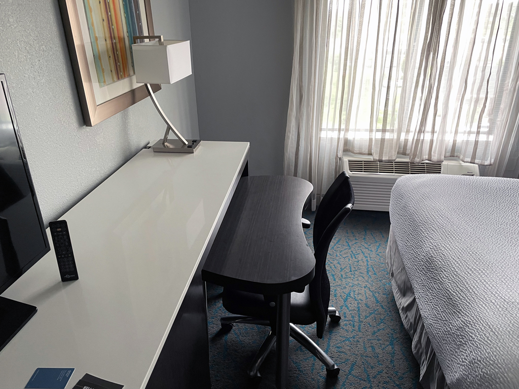 Der Schreibtisch ist unter dem Highboard verstaut. Da er auf Rollen gelagert ist, kann man ihn leicht herausziehen. Durch die Unterbringung unter dem Highboard ist der Schreibtisch nicht sehr hoch, weswegen der Schreibtischstuhl extrem niedrig ist. Dadurch ist die Sitzposition – gerade für große Menschen – alles andere als ideal. Einen ganzen Arbeitstag möchte man deshalb sicherlich nicht ins Zimmer des Fairfield Inns verlegen.