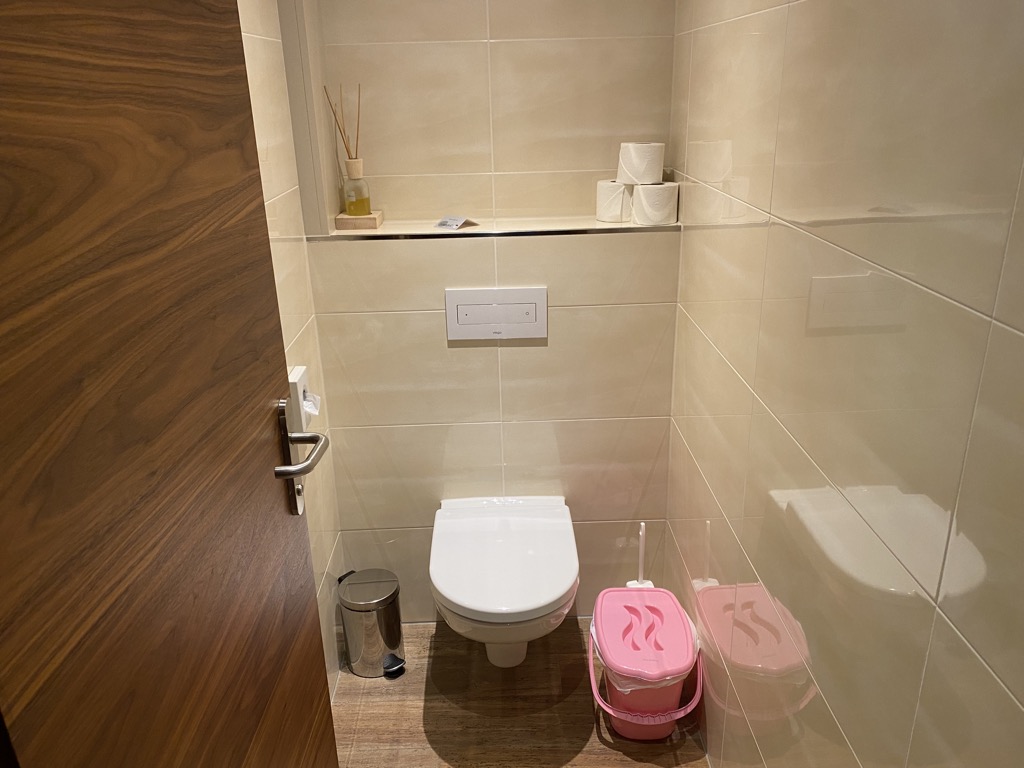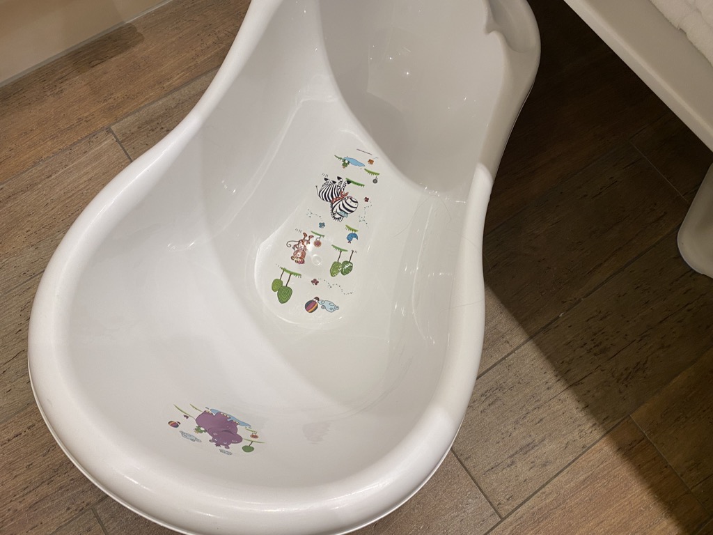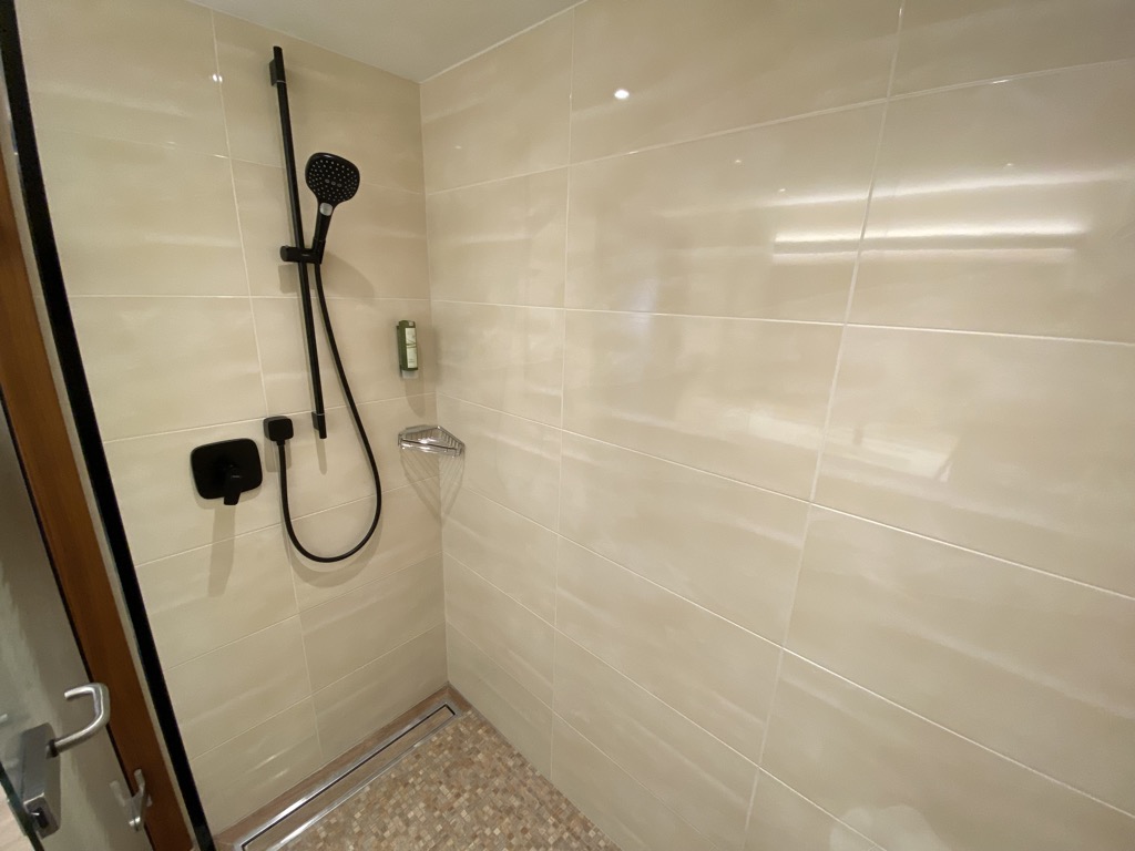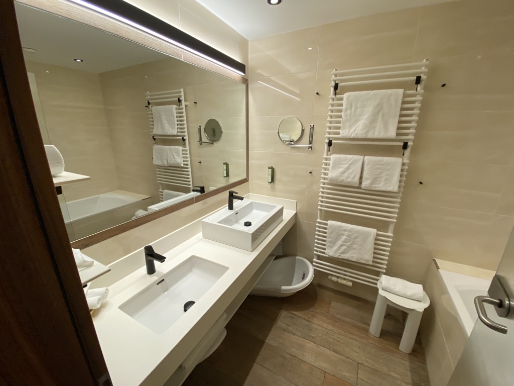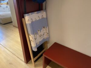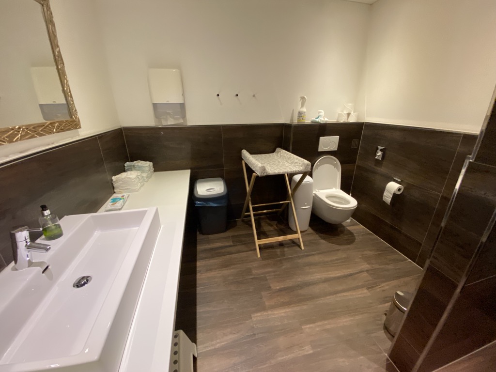 Ausgestattet war das Zimmer mit einem Badezimmer mit Walk-In Dusche, Waschbecken, Babybadewanne und Amenities. Das WC war separiert und dort gab es einen speziellen Windeleimer. Gegenüber des Badezimmers befand sich der Kleiderschrank, eine kleine Garderobe und der Klappwickeltisch.