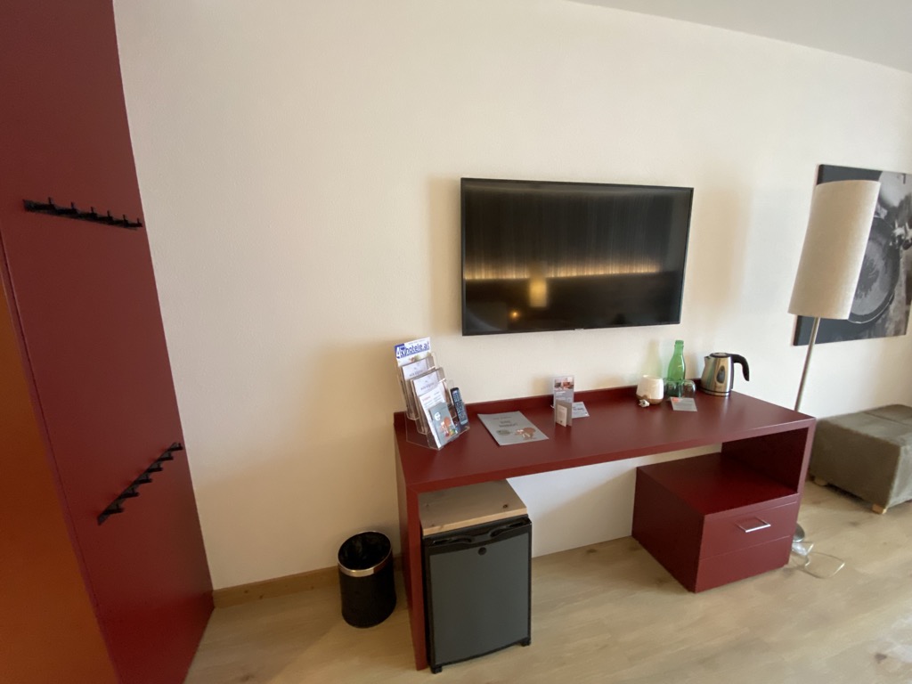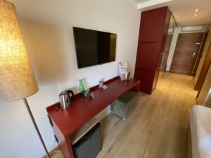 Zentrales Element des Zimmers war das große Bett inkl. Nachttischen. Gegenüber des Bettes befand sich eine Ablage, auf der ein Wasserkocher bereit stand und einige Infos lagen. Hier war in der Wand der Fernseher verbaut.
