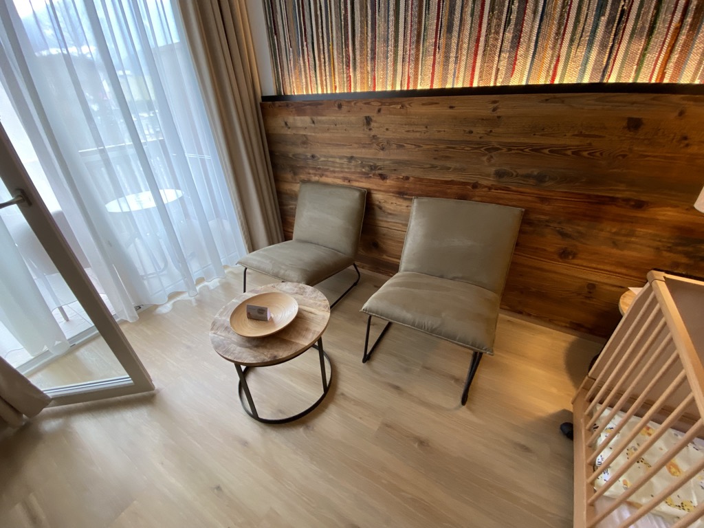 Im Zimmer gab es auch eine kleine Sitzecke, die man in eine Schlafcouch (nicht auf den Bildern zu sehen) hätte umwandeln können. Neben der Sitzgruppe führte ein bodentiefes Fenster zum Balkon, auf dem man wunderbar verweilen kann. Im Zimmer warteten bereits Bademäntel und Hausschuhe für uns und Kapuzenhandtücher und Bilderbücher für die Kinder. Ein tolles Willkommensgeschenk!