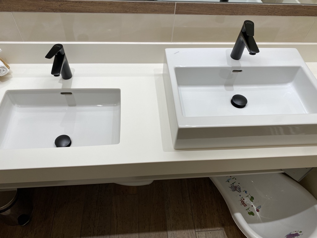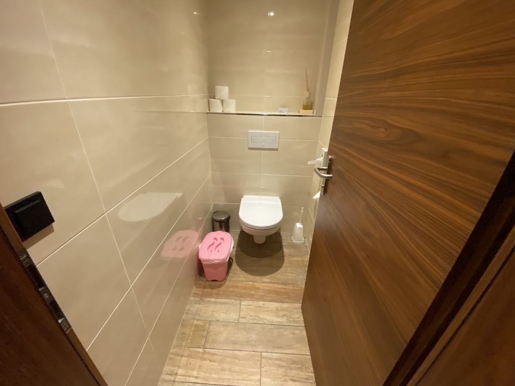 Ausgestattet war das Zimmer mit einem Badezimmer mit Walk-In Dusche, Waschbecken, Babybadewanne und Amenities. Das WC war separiert und dort gab es einen speziellen Windeleimer. Gegenüber des Badezimmers befand sich der Kleiderschrank, eine kleine Garderobe und der Klappwickeltisch.