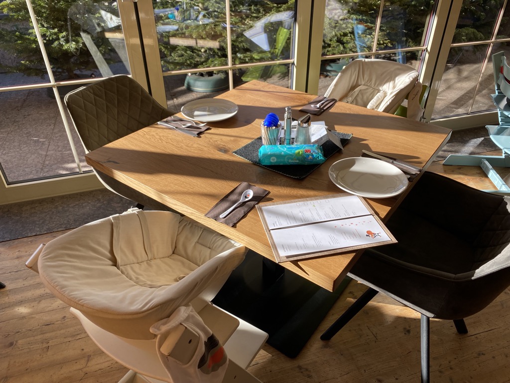Im gesamten Hotel in den Speiseräumen stehen viele Hochstühle für verschiedene Altersgruppen zur Verfügung. Im Speisesaal für das Abendessen stehen diese fest an den zugewiesenen Tischen – im Speisesaal für den Mittagstisch und die Jause kann man diese anordnen wie man möchte. Auch Neugeborenenaufsätze sind vorhanden.