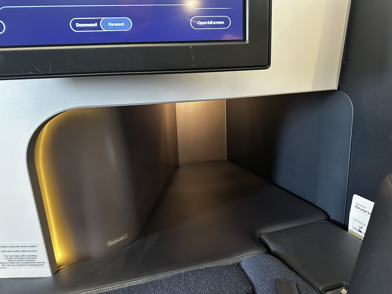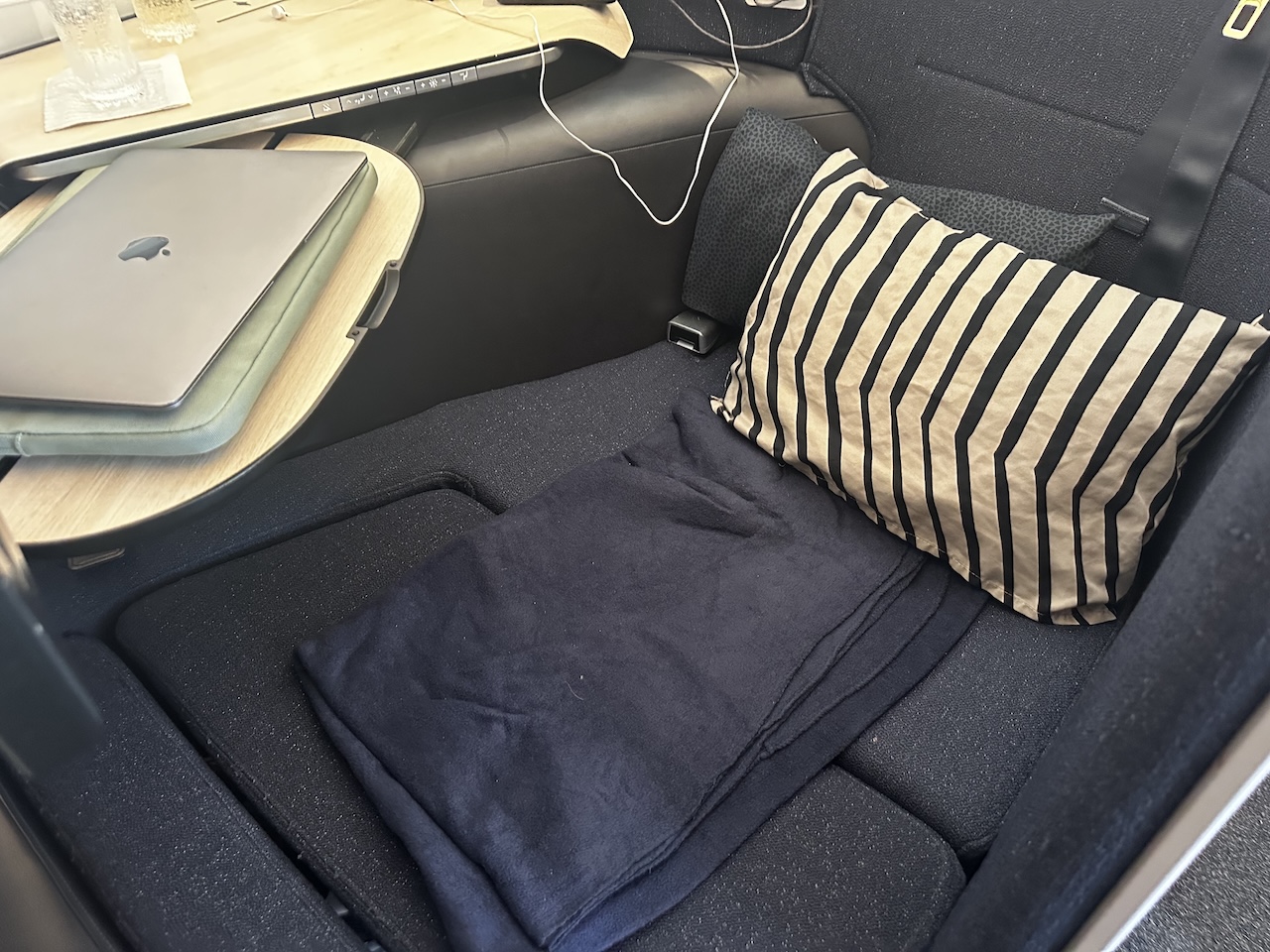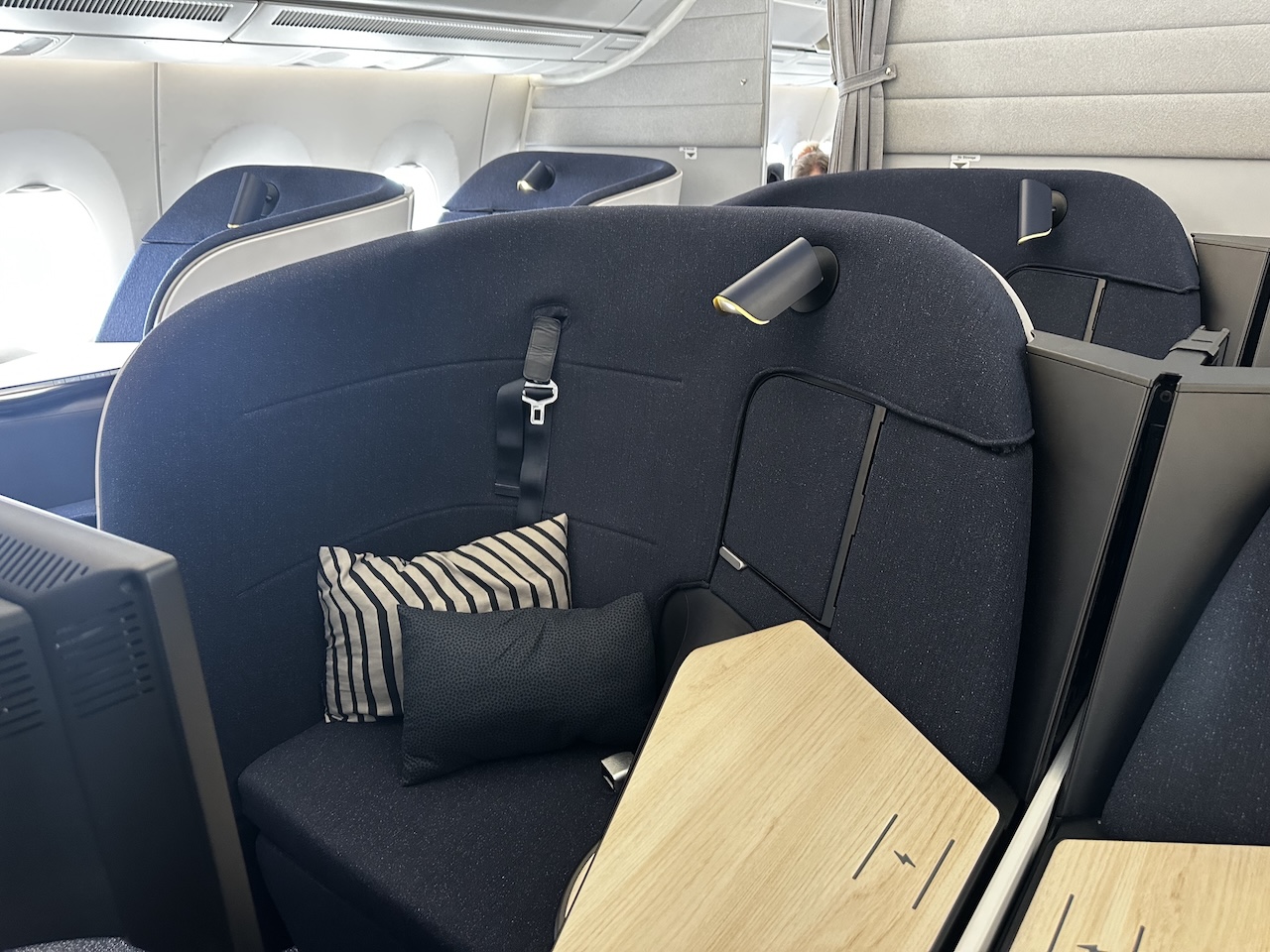 Und mit dem Sitz komme ich trotz Rückenproblemen ausgesprochen gut zurecht (mehrfach Business Hel – ICN und zurück inklusive der verlängerten Flugzeiten). Zum Schlafen gibt es die Auflage. Super Konzept.