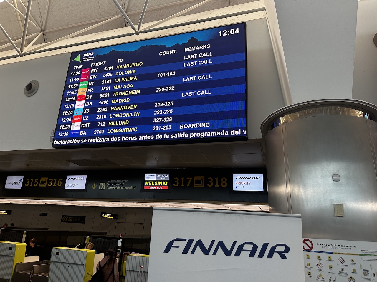 Am Flughafen Las Palmas war einiges los, vor den Schaltern von Finnair warteten aber nur wenige Passagiere. Einer von drei Schaltern war als Priority-Desk ausgewiesen, dort konnten wir ohne weitere Wartezeiten unsere Koffer loswerden.