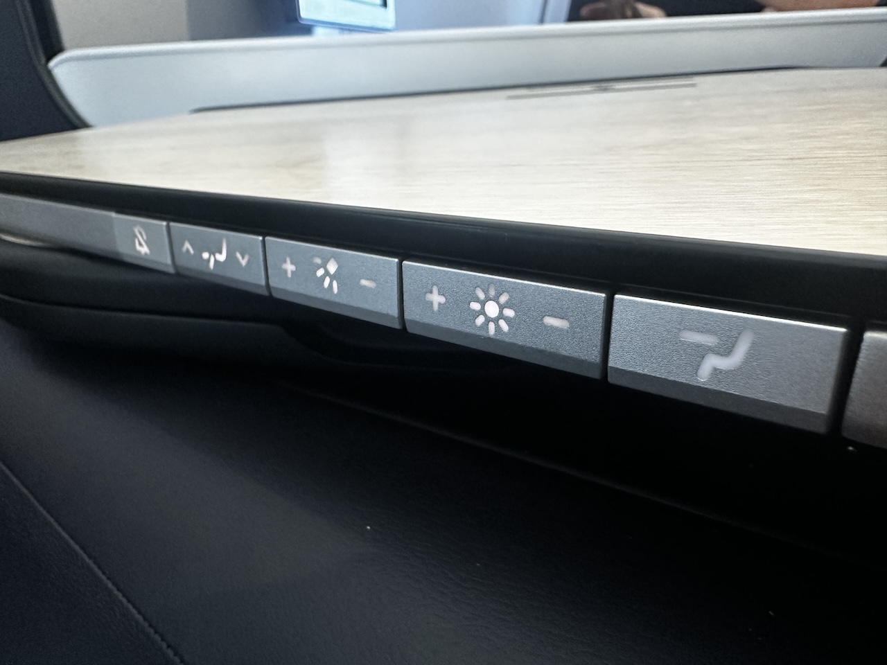 Das Bedienfeld ist entsprechend übersichtlich, hier kann man noch den Tisch entriegeln und die Beleuchtung regeln. Für das Entertainment System ist eine eigene Fernbedienung vorhanden.