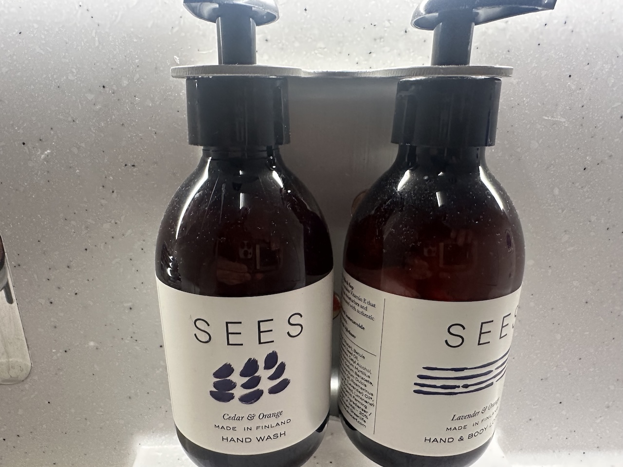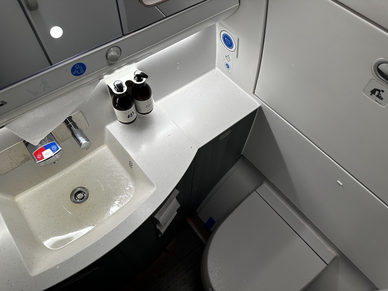 Zum Sitz gehören zwei Ablagefächer, eine Ladestation und gleich zwei Steckdosen. Amenity Kits werden nur auf den Langstrecken verteilt, in den Waschräumen ist aber zumindest Bodylotion verfügbar.