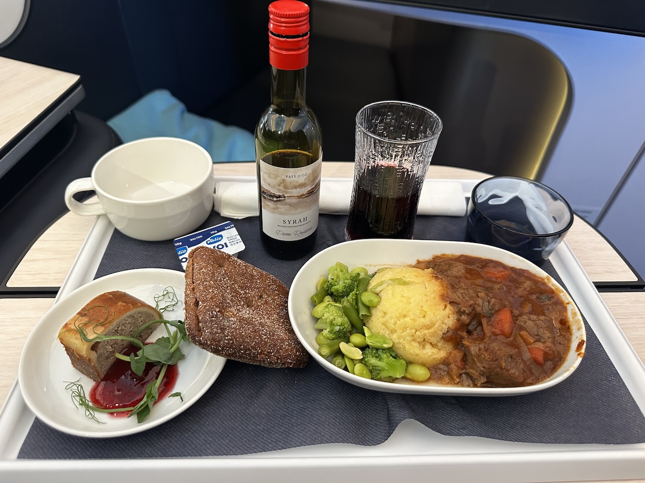 Etwas später kam dann das Essen auf einem Tablett zusammen mit einer Vorspeise, Brot und weiteren Getränken. Es gab keine Speisekarten und auch keine Mahlzeitenauswahl. Achtet also darauf, Euer Wunschmenü bei einem Finnair Flug rechtzeitig vorzubestellen.