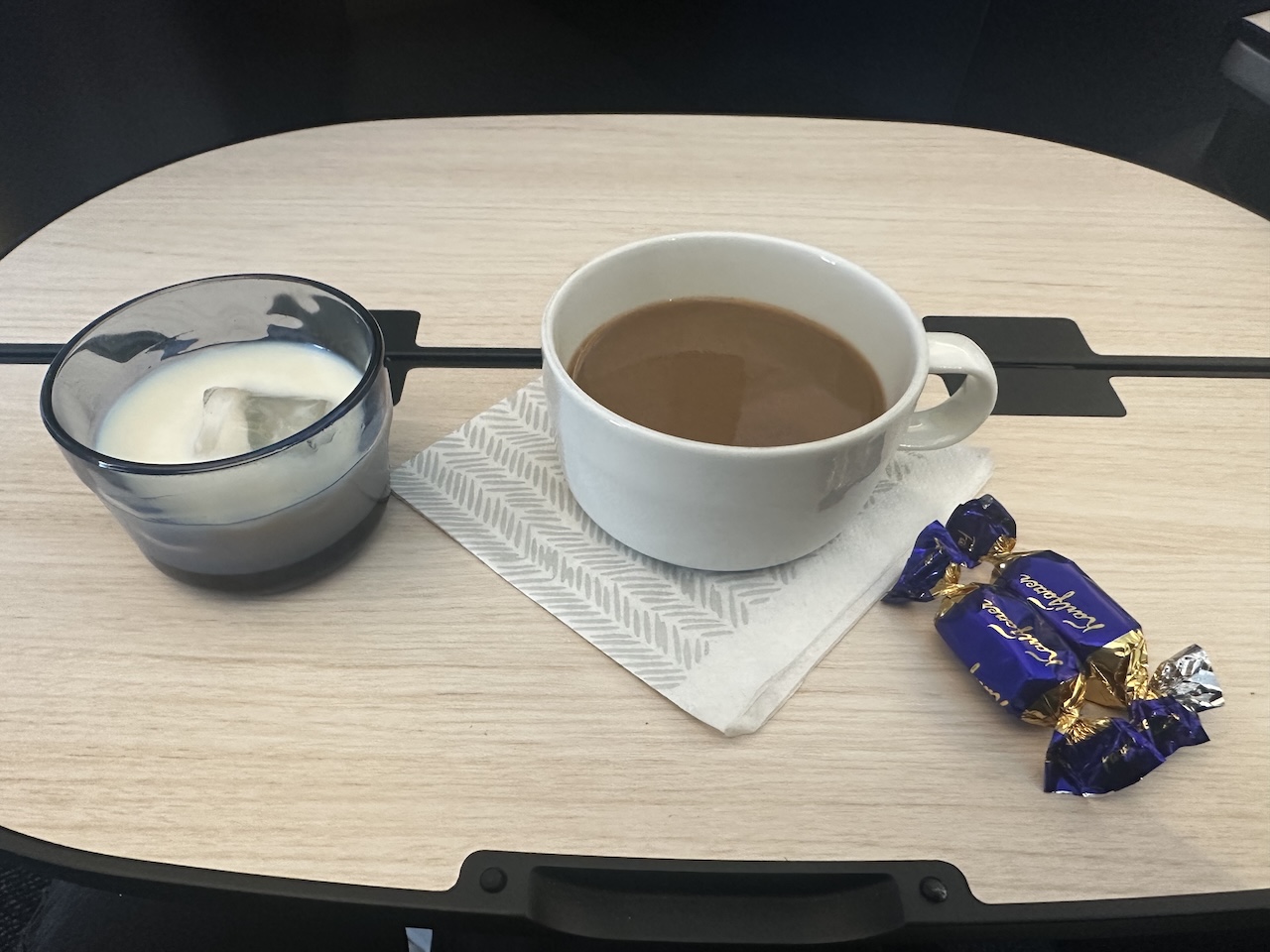 Ich hatte im Vorfeld Garnelen mit Pasta und ein Gulasch reserviert. Abschließend wurden Kaffee, Tee und Digestifs angeboten. Dazu gab es Schokolade.