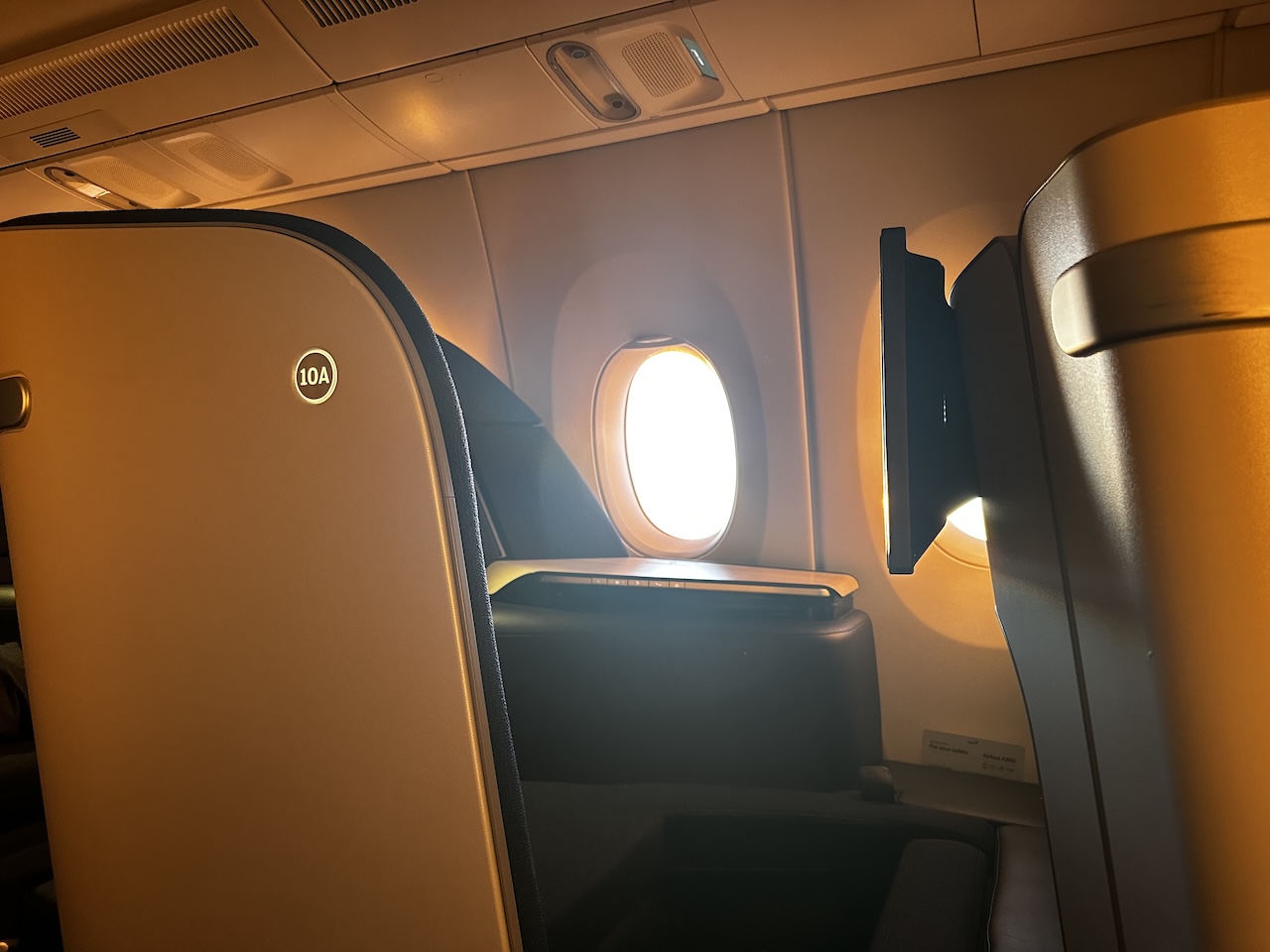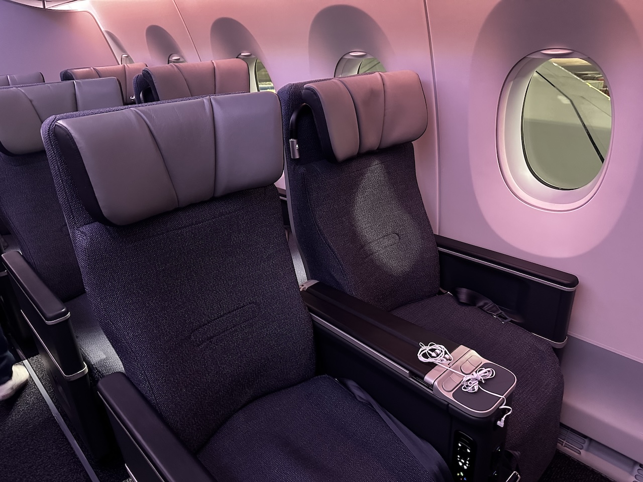Die Maschine parkte auf dem Vorfeld, wir mussten also mit Bussen zum Airbus A350 fahren. Dort warteten wir noch etwa 10 Minuten bis wir dann ins Flugzeug durften. Zwei gut gelaunte Flugbegleiterinnen begrüßten uns und halfen den Einsteigenden bei der Orientierung.