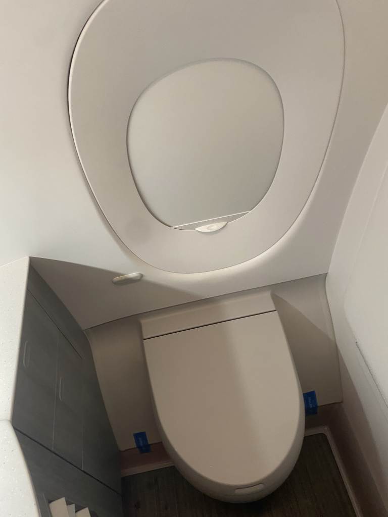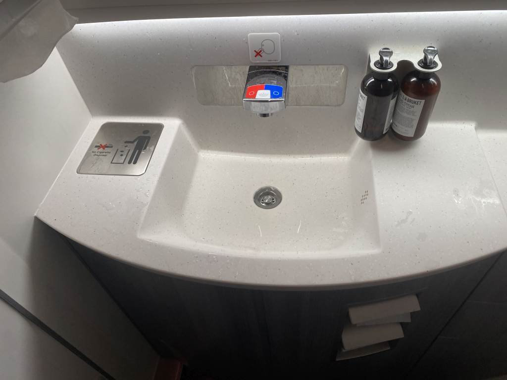 Demnach befinden sich die Toiletten natürlich im vorderen Bereich der Business Class. Die beiden Lavatories sind gerade mal so groß, dass der Wechsel in den (selbst mitgebrachten) Pyjama einigermaßen geklappt hat. Viel hat jedoch nicht daran erinnert, dass dies die Toiletten der Business Class sind. Deko und Amenities waren weitestgehend nicht vorhanden.