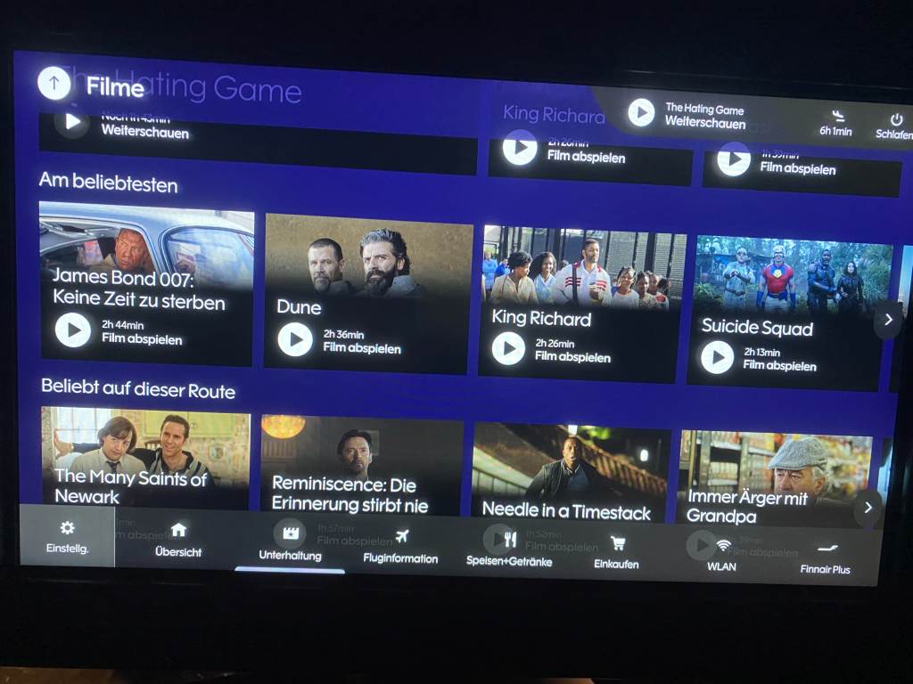 Bei fast 13 Stunden Flugzeit ist ein gutes Entertainment-System schon Pflicht. Die Auswahl bei Finnair empfinde ich im Vergleich zu anderen Airlines weiterhin überschaubar. Zwar bietet das IFE auch eine Auswahl absolut aktueller Blockbuster, wie dem Bond-Streifen „Keine Zeit zu Sterben“, aber man ist mit dem Programm auch schnell durch. Ich weiß nicht, wie oft ich den Damen „Pets 2“ neu gestartet habe.