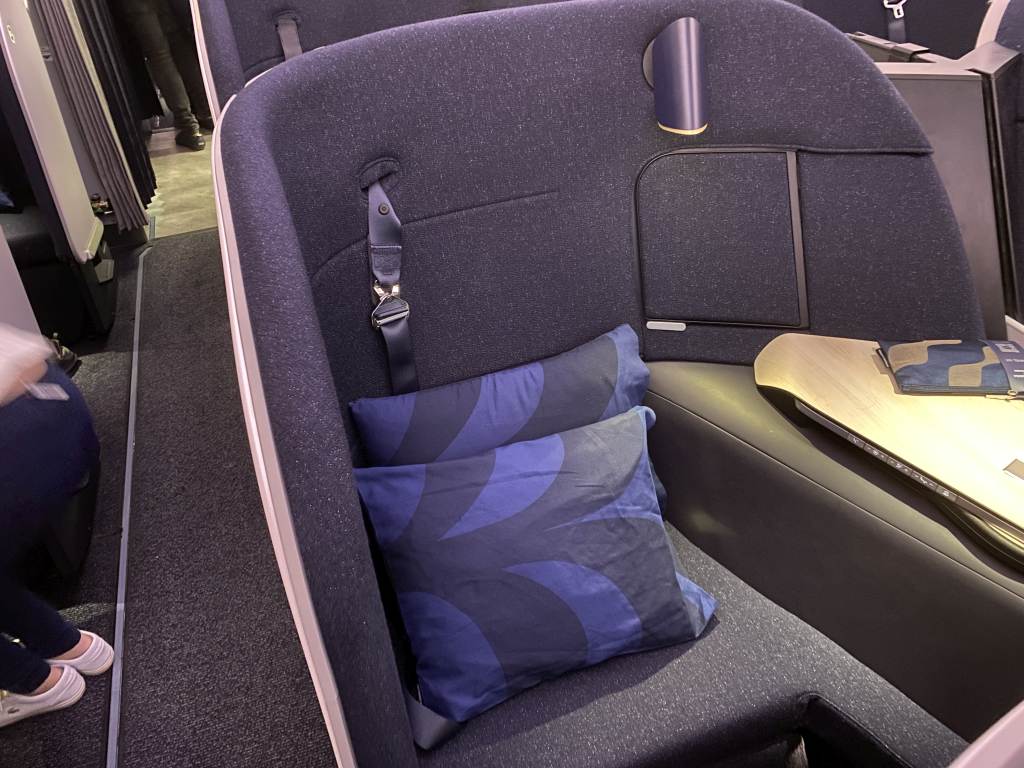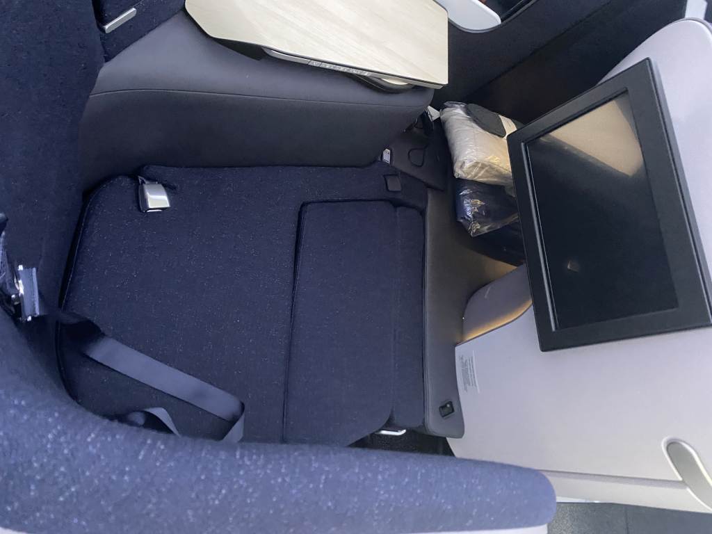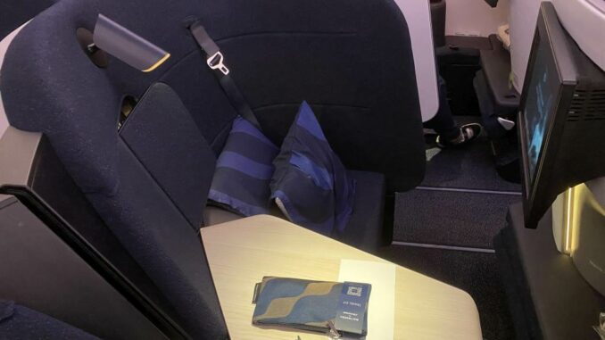 Viel wurde über den neuen Business Class Sitz berichtet, so auch bei uns. Und ich war hin und her gerissen. Auf vielen Fotos sah der Sitz echt eng aus. Und es gab von innereuropäischen Flügen schon berichte, dass der Sitz ohne zusätzliche Kissen echt hart ist, da jegliche Polsterung im Rücken fehlt. Auch der schmale Fußraum wurde im Vorfeld bemängelt.