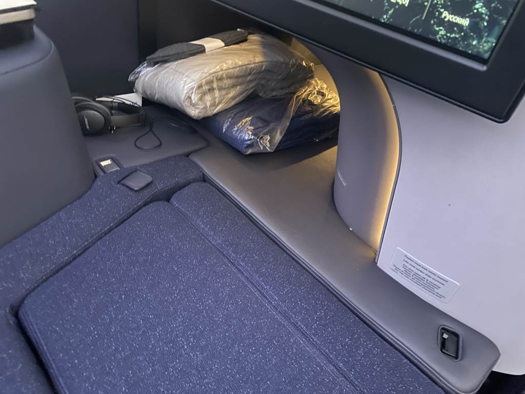 Nachdem wir die Lücke zwischen Sitzfläche und Fußraum per Knopfdruck geschlossen und noch einen kleineren Steg manuell ausgeklappt hatten, konnten wir auch die Bettauflage passgenau auf unseren Sitzen auslegen. Jeder Fluggast bekommt in der Business Class außerdem ein hartes und ein weiches Kissen, die dabei helfen sollen, die gemütlichste Position zu finden. Und die kann man finden. Auf dem neuen Sitz kann man so richtig schön rumhängen. Und das auch knapp 13 Stunden.