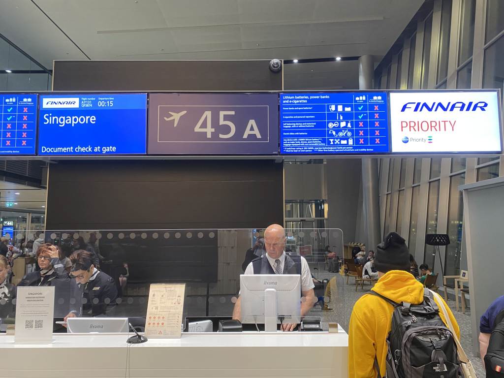 Von der Finnair Business Class Lounge im Non-Schengen Bereich waren es dann noch ein paar Minuten Fußweg zu unserem Gate 45A. Spannenderweise wurde schon deutlich mehr als eine Stunde vor Abflug „Go to Gate“ an den Fluggastinformationen angezeigt. Den Grund erkannten wir bei der Ankunft am Gate. Es bildeten sich dort Schlangen beim finalen Dokumenten-Check. Für Status- und Business Class Gäste gab es eine separate Priority Lane, die uns schnell zum Wartebereich im Gate beförderte. Hier warteten dann auch Business Class und Economy Class Gäste in getrennten Bereichen auf das Boarding.