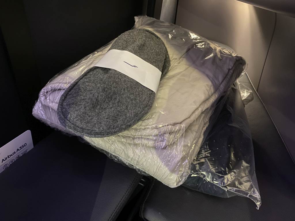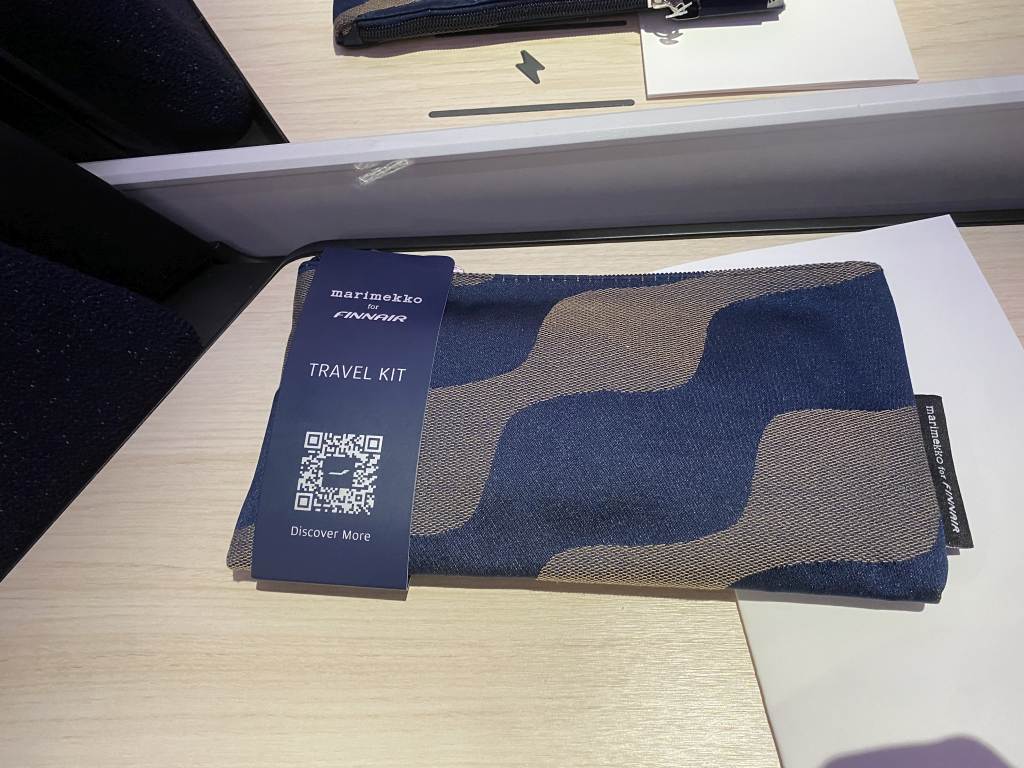 Ganz klar der Schwachpunkt im Finnair Business Class Produkt. Als Amenity Kit gab es ein kleines Täschchen, wie ich es vielleicht noch in der Premium Economy Class akzeptabel gefunden hätte. Der Inhalt bestand aus einer Zahnbürste mit Zahnpasta, Feuchtigkeitscreme für Körper und Lippen, Ohrstöpseln und Schlafmaske. Socken beispielsweise waren Fehlanzeige, dafür lagen auf den Sitzen jedoch Slipper bereit. Auf Schlafanzüge wird leider selbst auf dieser Ultra-Langstrecke verzichtet.