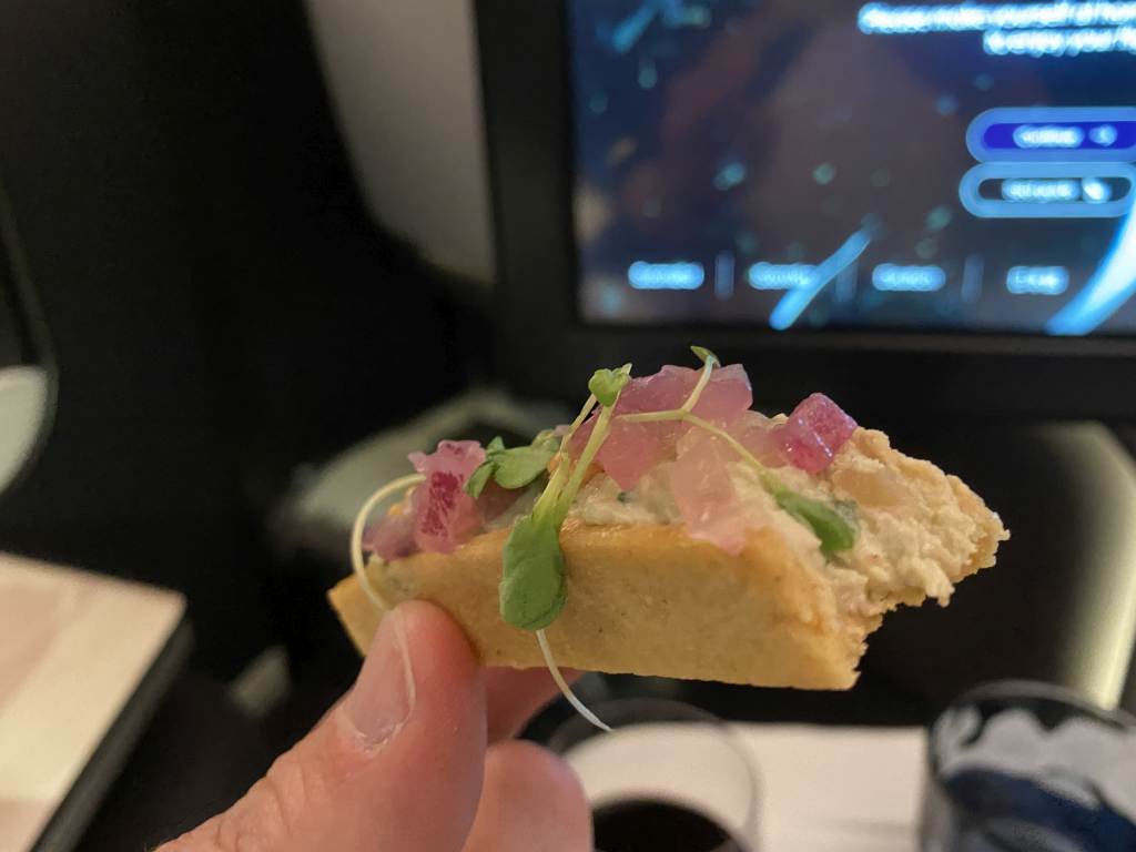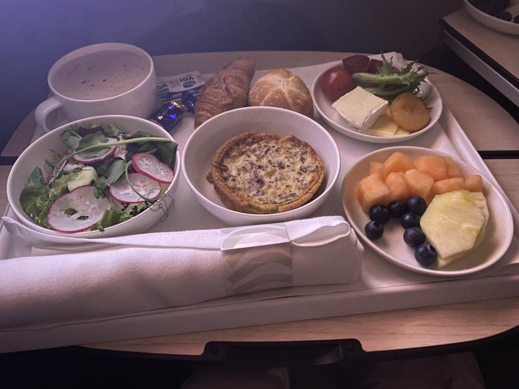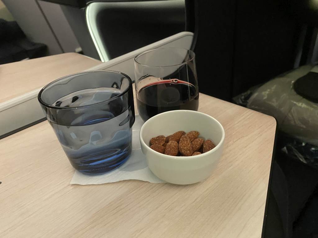 Leider stellte sich hier heraus, dass das gesamte Konzept noch nicht eingespielt ist. Wir hatten die geschmorten Rinderbäckchen online vorbestellt. An Bord wurden wir so ziemlich zuletzt nach unseren Wünschen für den Hauptgang gefragt. Mit dem Hinweis, dass das Rind nur noch einmal verfügbar wäre. Auf meinen Hinweis, dass wir genau das im Vorfeld vorbestellt hatten, wurde uns geantwortet, dass man keine Menüwünsche für diesen Flug in der Business Class verzeichnet hätte. Die Bitte, dass wir die Bestätigung heraussuchen, war mir dann etwas unangenehm.