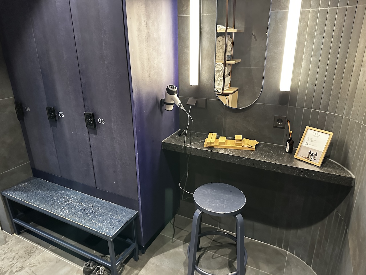 Highlight ist die Sauna. Damit bietet Finnair etwas Besonderes und typisch Finnisches. Vor der Sauna kann man sich in Ruhe umziehen. Neben den Umkleiden gibt es einen Aufenthaltsbereich zum Ausruhen.