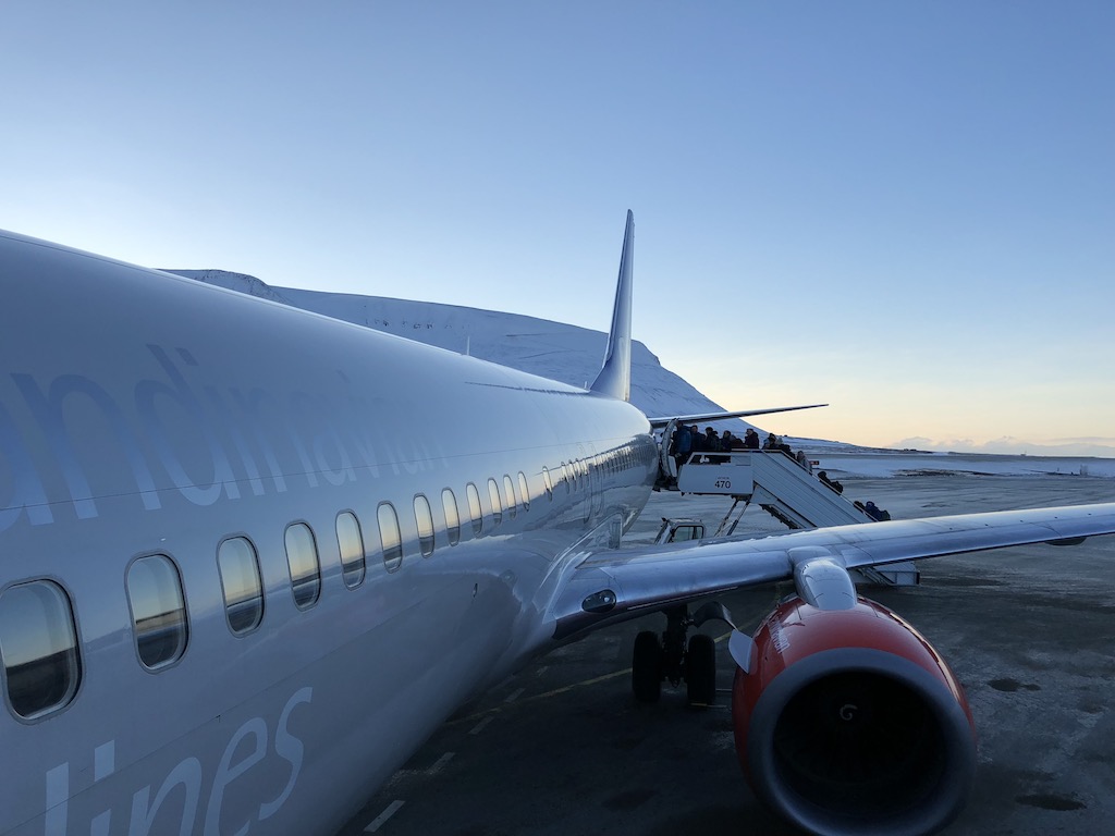Mit leichter Verspätung setzten wir mit Flug SK4494 in völliger Dunkelheit gegen 20:00 Uhr auf der einzigen Landebahn (10/28, 2.480 m) des Flugplatzes auf, welcher zwischen schneebedeckten Bergen und zugefrorenen Fjorden eingepfercht ist. Kurz vor dem Terminal kam unsere Boeing 737-800 zum Stehen – eine echte Parkposition, Gates oder vergleichbare übliche Dinge größerer Flughäfen gibt es hier nicht. Nach wenigen Momenten öffneten sich bereits die Türen und über die Treppen verließen wir das Flugzeug in die eiskalte arktische Nacht. Der Wind ähnelte einem Schlag ins Gesicht und wir eilten schnellstmöglich mit den übrigen Passagieren über das vollkommen vereiste Vorfeld in ein kleines spärlich beleuchtetes Gebäude, welches sich als Terminal herausstellte.