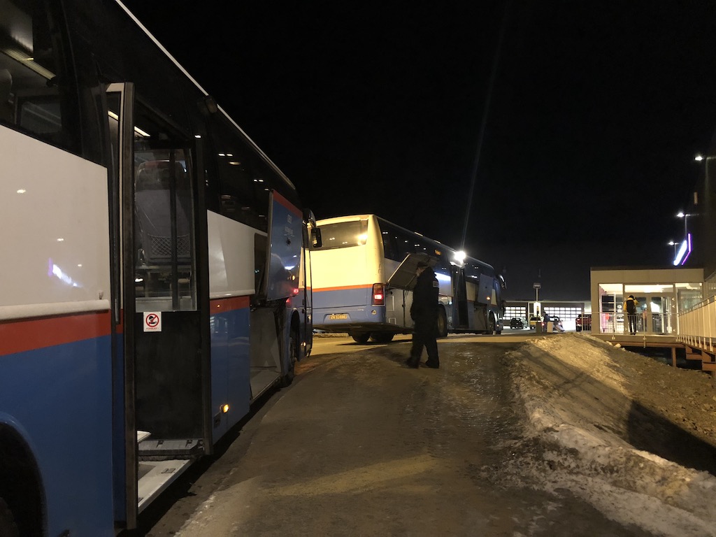 Der Flughafen betreibt einige Busse, die Flybussen, welche pünktlich zur Ankunft die Passagiere direkt in die verschiedenen Hotels bringen. Die Optionen zur Unterkunft beschreibe ich in einem weiteren Artikel. Die Busse selbst verkaufen Return-Tickets für rund 15 Euro pro Passagier – kein Schnäppchen, aber wer das erwartet, hat auf Spitzbergen leider nichts verloren, denn hier ist alles sehr teuer. Ein Taxi dürfte mit rund 20 bis 25 Euro zu Buche schlagen, wenn eines am Terminal steht. Wir selbst entschieden uns für den Flybussen, und waren keine 15 Minuten später vor unserem Hotel. Am Tag des Rückfluges holte uns der Bus exakt zwei Stunden vor Abflug wieder am Hotel ab und brachte uns mit zahlreichen anderen Passagieren des Fluges zurück nach Tromsø, wo erneut eine Passkontrolle zur Einreise mit Zolldurchgang auf uns wartete.