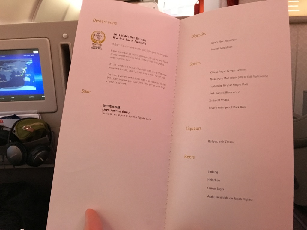 Es wurden Menükarten verteilt und noch vor dem Start abgefragt, was man Essen und Trinken wolle und ob man zum Frühstück geweckt werden wolle. Dabei wurde bei diesem späten Abflug kein volles Abendessen mehr serviert, vielmehr gab es ein Snack Menü, aus welchem man sich noch einige Speisen aussuchen konnte.