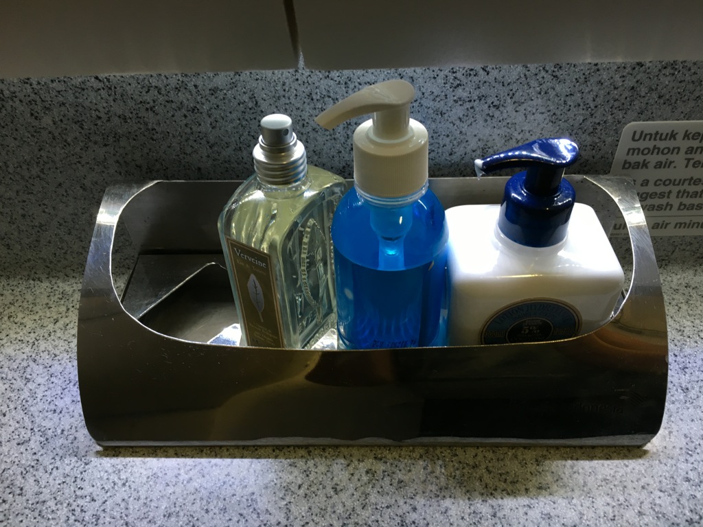 Noch vor dem Start habe ich im Bad meinen selbst mitgebrachten Pyjama angezogen. Neben dem sehr umfangreichen Garuda Amenity Kit, gab es auf den Toiletten auch noch Handcreme und Parfüm für die Gäste.