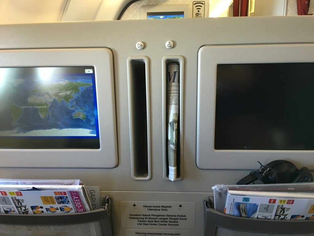 Sehr positiv natürlich immer die Steckdosen an jedem Platz. Für die Kopfhörer gab es einen gut positionierten Anschluss über der Armlehne. Auch einen USB Anschluss, an welchen man noch ein weiteres Gerät laden kann gab es. Übrigens verfügte dieser Garuda Indonesia Airbus A330 auch über in flight WIFI. Allerdings habe ich es nichts genutzt und kann daher nichts über die Geschwindigkeit sagen.
