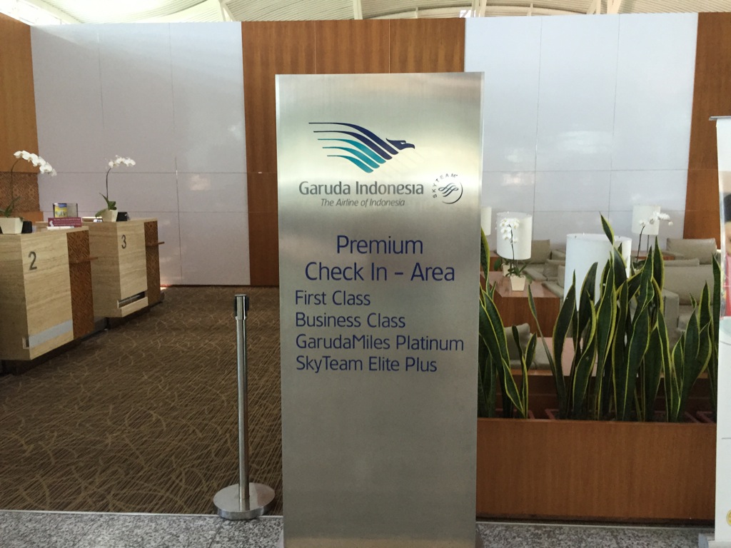 Garuda betreibt in Bali eine eigene kleine Check- In Lounge für First- und Business Class Passagiere, sowie Passagiere mit Sky Team Status. Dabei besteht diese Check- In Lounge nur aus einigen Sitzgruppen mit Sesseln und den Check-In Schaltern. Wartezeit gibt es an diesen Schaltern aber wohl so gut wie nie.