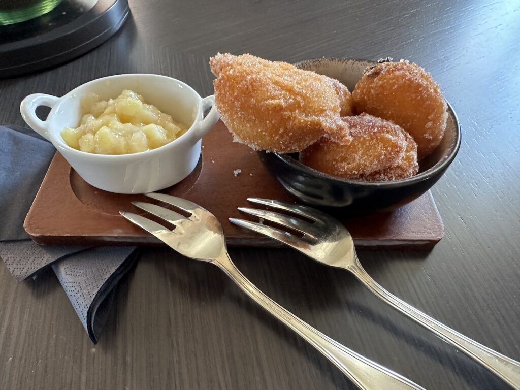 Bei der Buchung fügten wir einen Hinweis auf meinen Geburtstag hinzu. Wir hofften hier auf eine kleine Aufmerksamkeit in Form eines Sekts oder Weins auf dem Zimmer. Dies erhielten wir nicht, dafür wurden uns aber sehr leckere Schmalzkuchen mit Apfelkompott aufs Zimmer gestellt.