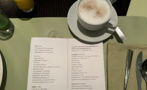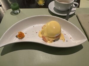 Vom Frühstück waren wir beide sehr positiv angetan, beim Betreten des Restaurants wurden wir freundlich empfangen. Am Platz angekommen wurden wir auch gleich nach unserem Kaffee- oder Teewunsch gefragt. Außerdem wurden wir auf die extra Speisekarte mit weiteren Eierspeisen hingewiesen. Hier entschieden wir uns für ein sehr gutes Eggs Benedict mit Lachs.