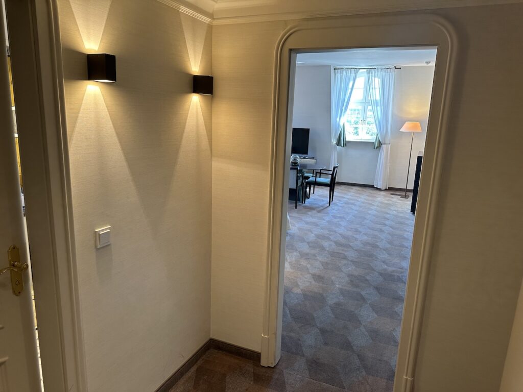 Das Entrée ist lediglich ein kleiner Flur ohne Schränke, dafür mit einer Zugangstür zum Nachbarzimmer. Während unseres Aufenthalts konnten wir stets leise den Fernseher von nebenan hören, da es aber zum Schlafzimmer eine extra Tür gibt, störte dies nicht weiter.