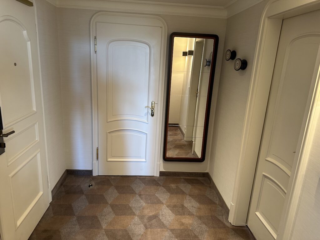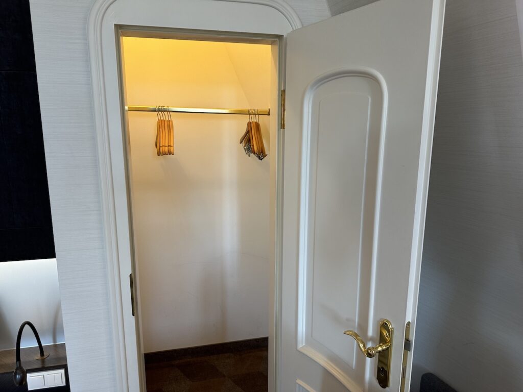 In der gesamten Suite gibt es keinen Kleiderschrank, dafür eine extra Kammer mit Bügeln – jedoch ohne Fächer zum Sortieren der Kleidung.