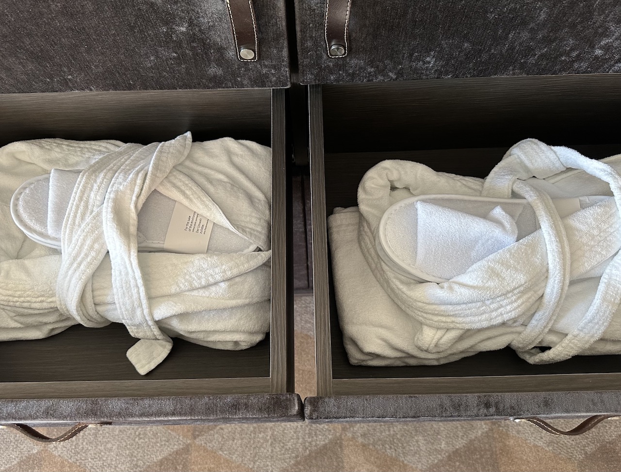 In der gesamten Suite gibt es keinen Kleiderschrank, dafür eine extra Kammer mit Bügeln – jedoch ohne Fächer zum Sortieren der Kleidung.
