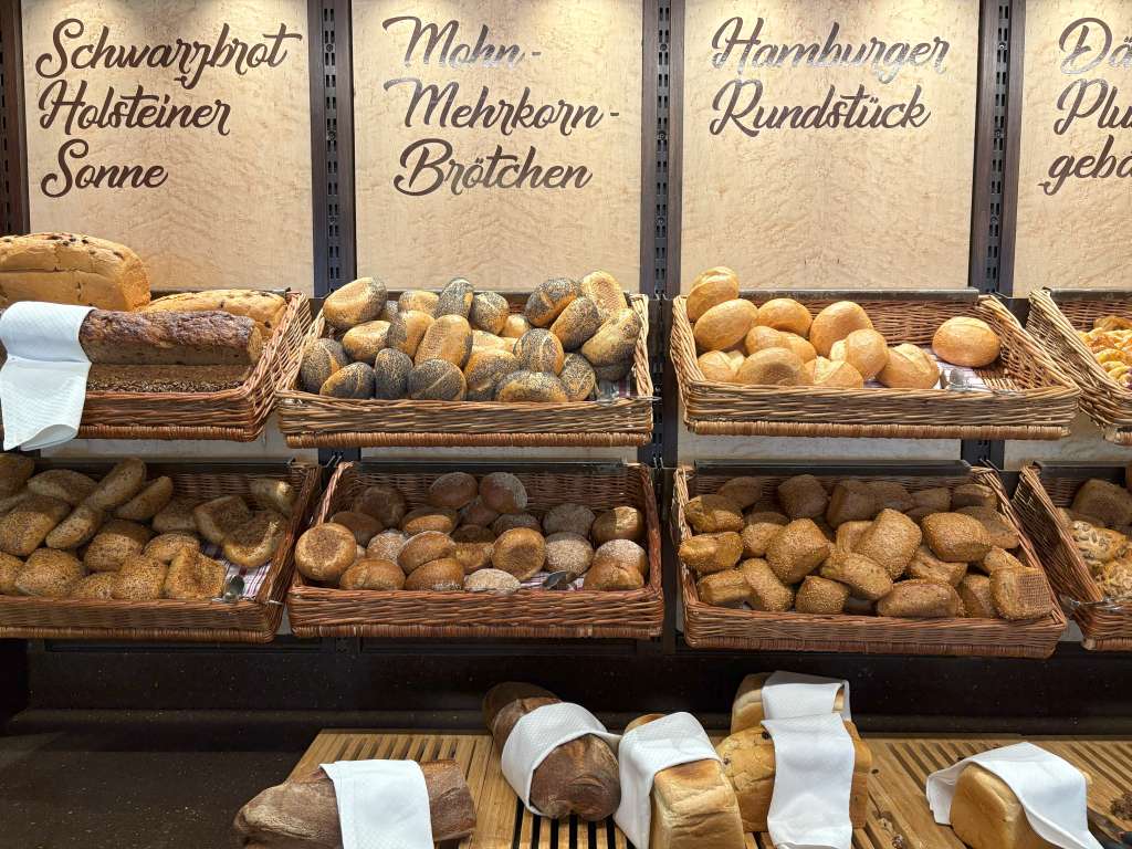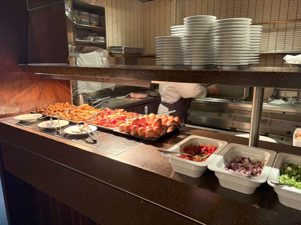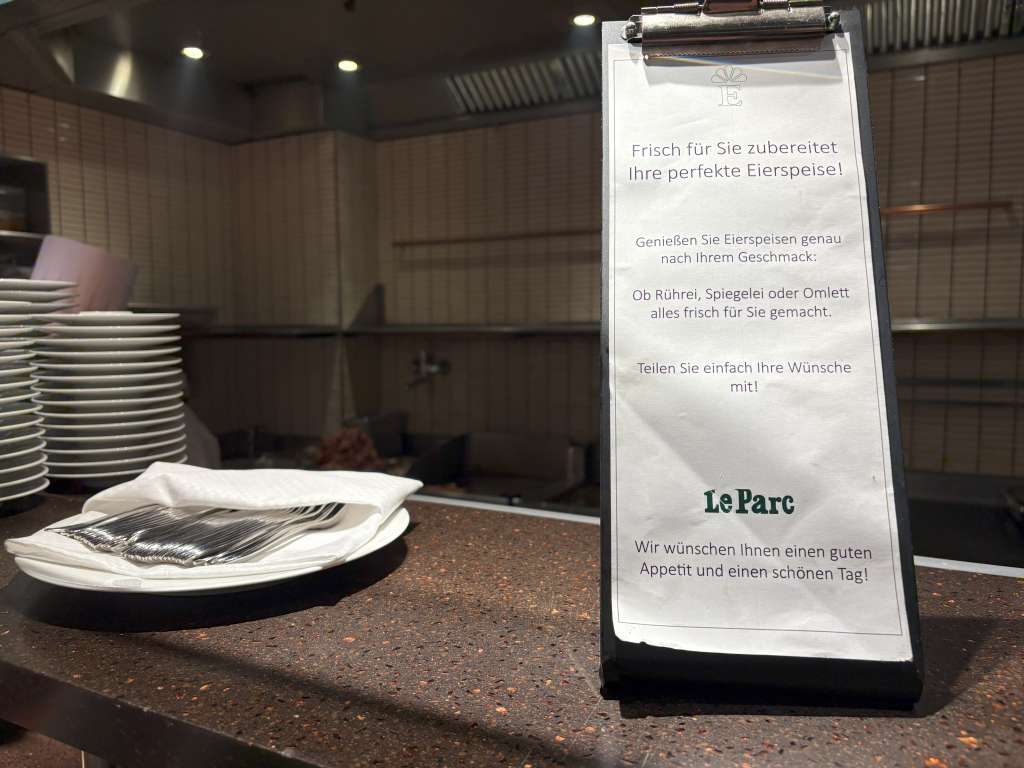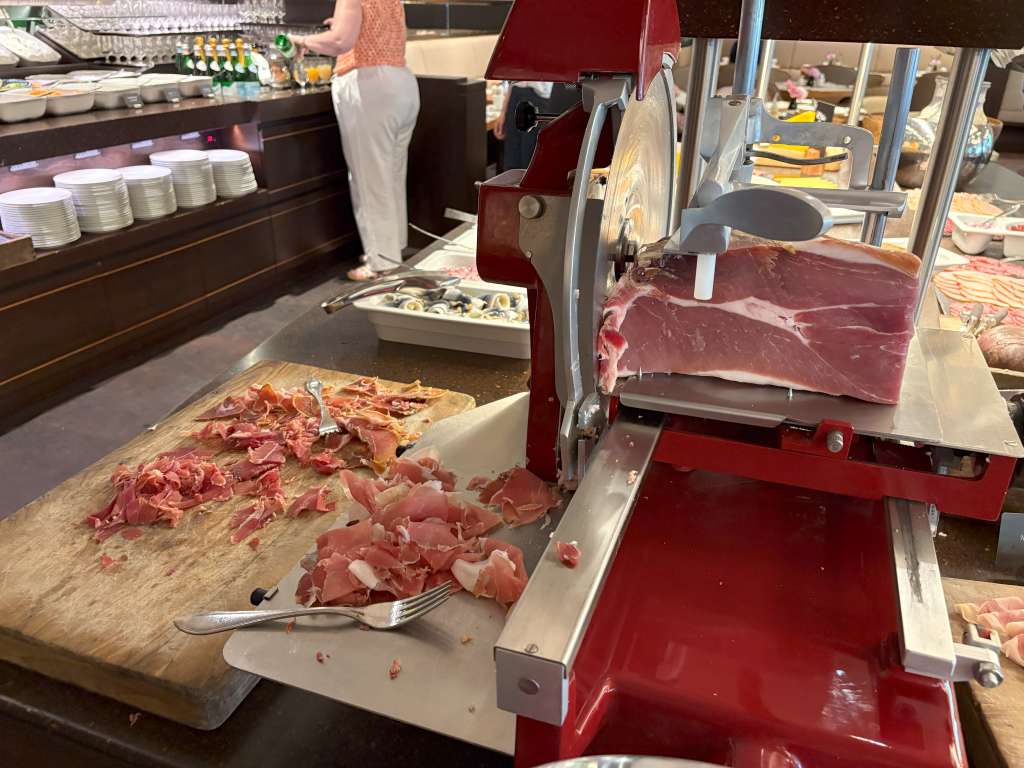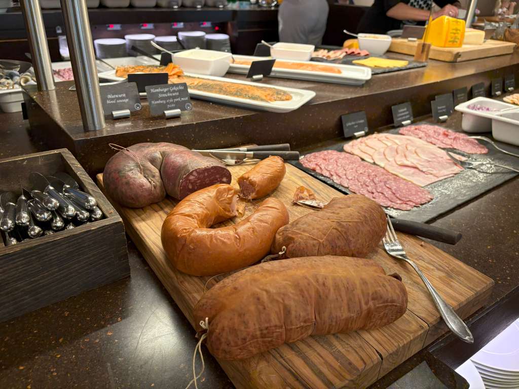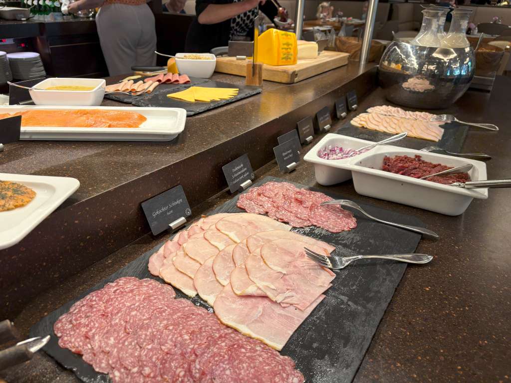 Ein kleines Detail erhaschte direkt meine Aufmerksamkeit. Während die Getränkewünsche direkt am Tisch aufgenommen wurden, wurden die Eierspeisen auf Anfrage an einer eigenen Station zubereitet. Eine helle Freude dürften Gäste haben, die viel Wert auf frische Backwaren und qualitativ hervorragenden Wurstaufschnitt legen. Denn neben einer umfangreichen Wurstauswahl wurde auch Rindermett und auch Lachsaufschnitt präsentiert. Meine Töchter verliebten sich direkt in den Service-Mitarbeiter, der mit der Maschine Scheiben vom Schinkenbein schnitt. Ein Berg davon landete auf dem Teller der jungen Damen.