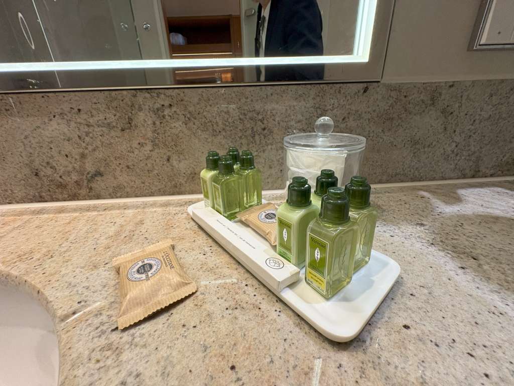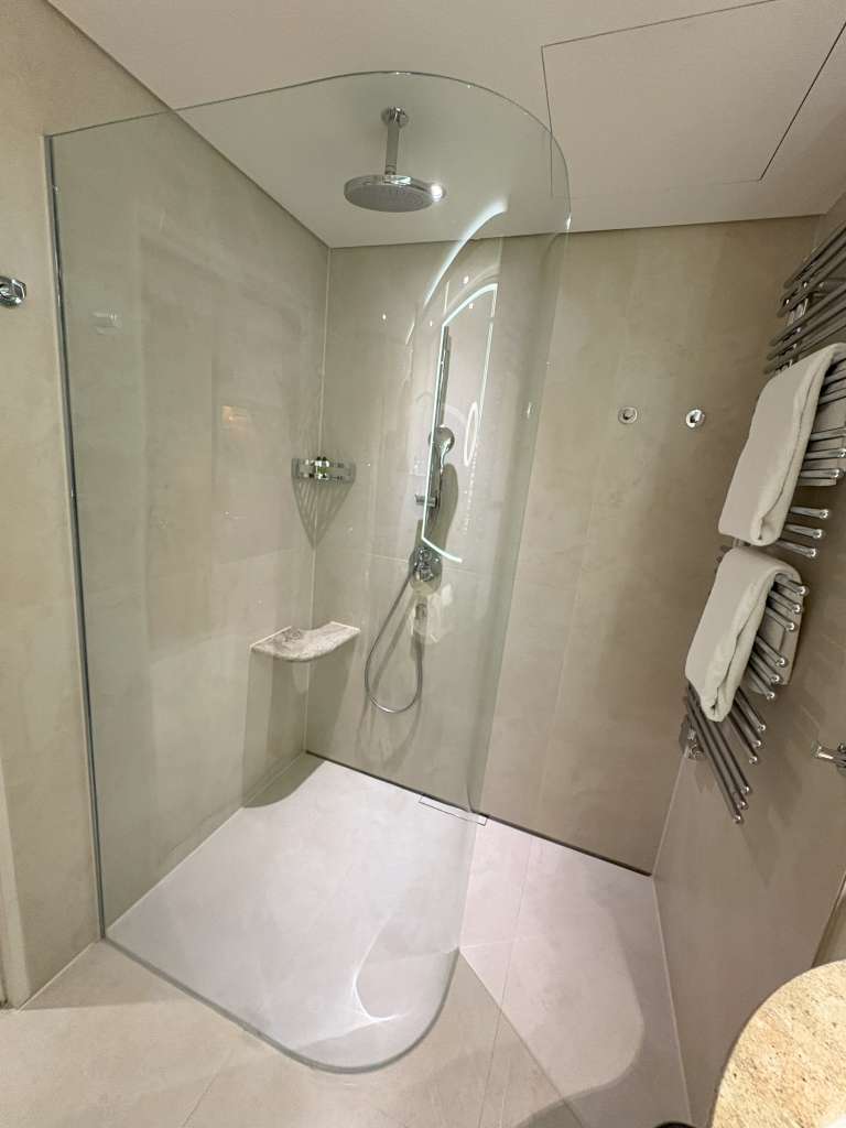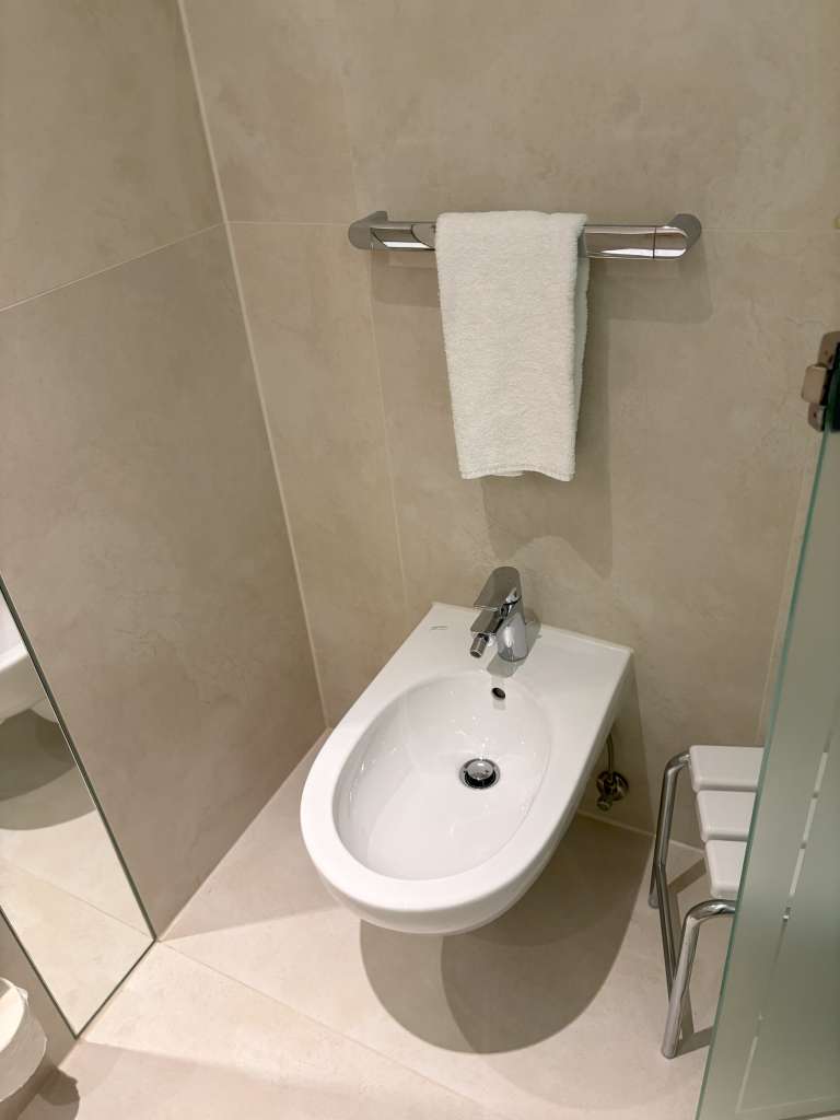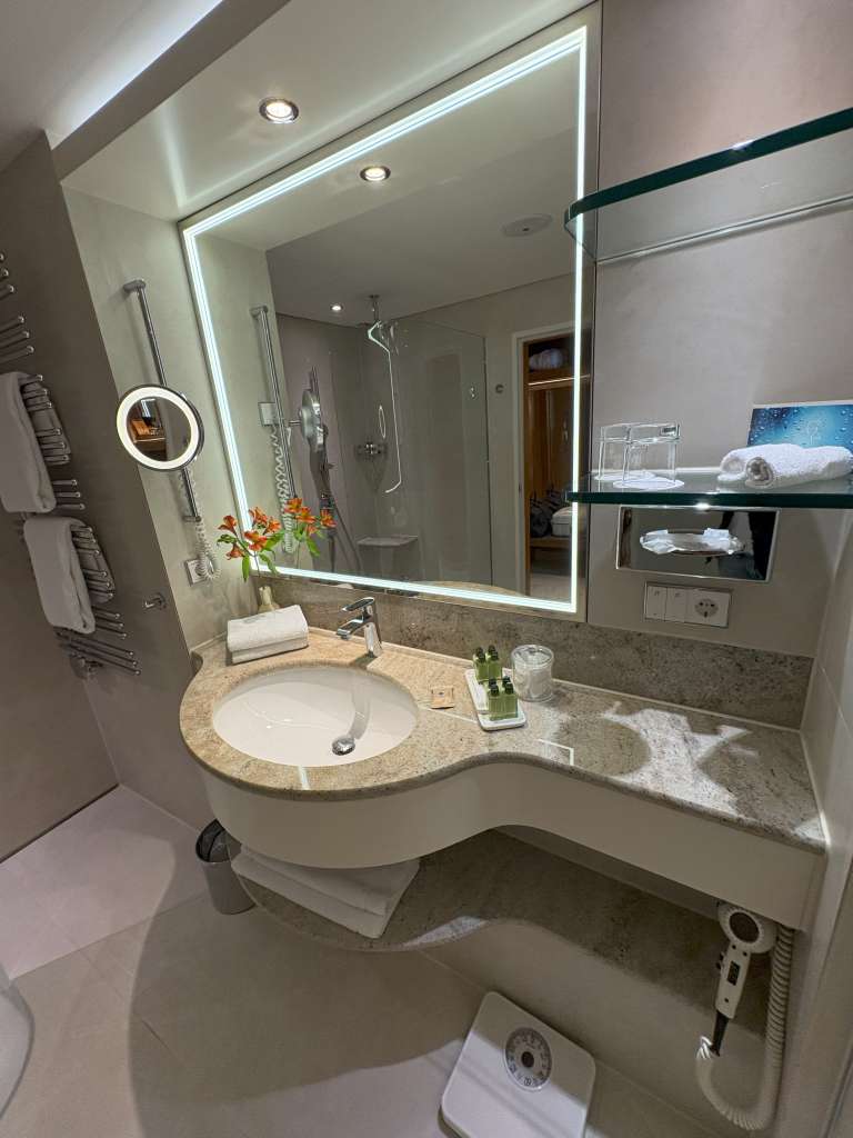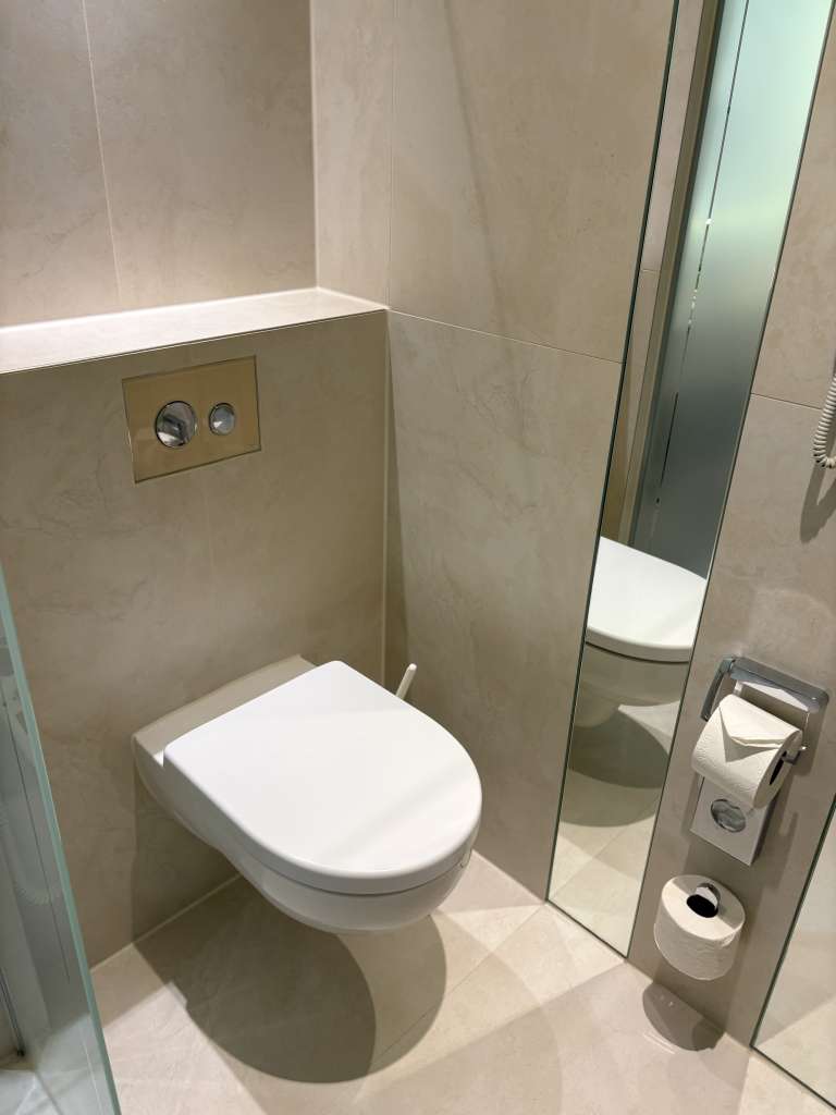 Das Badezimmer strahlte Funktionalität und gehobenen Luxus aus. Wirkte die bodentiefe Dusche noch eher einfach, war das Waschbecken in stilvollem Marmor eingefasst. Endlich bot ein Hotel mal wieder Pflegeprodukte in kleinen Fläschchen an, die man so gerne mitnimmt. Insbesondere, da es sich hierbei um die Marke Rituals handelte, die es so früher auch bei diversen anderen Hotelmarken gab. Komplettiert wurde der funktionale Badezimmerteil durch ein WC und ein gegenüberliegendes Bidet.