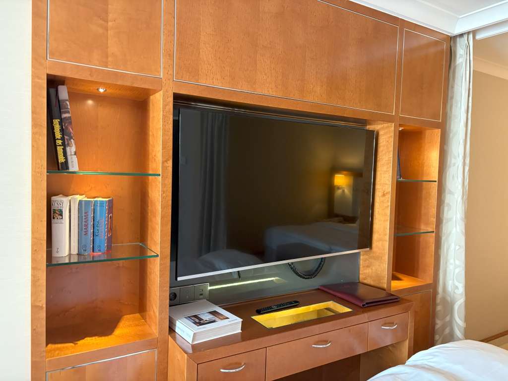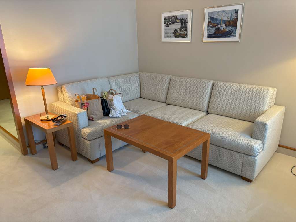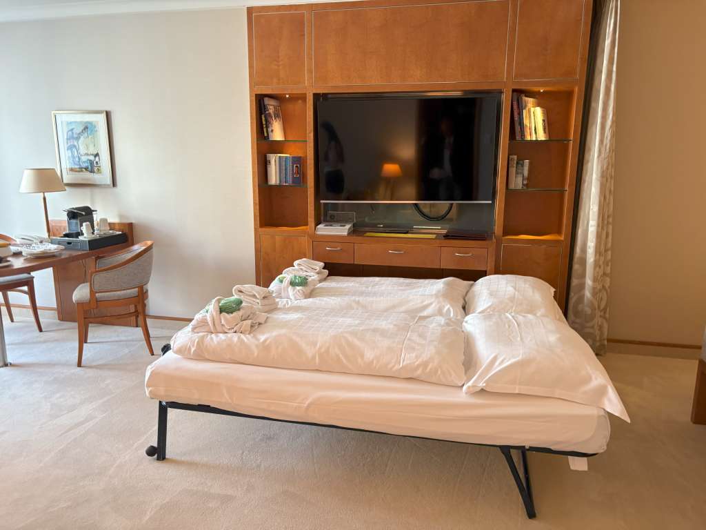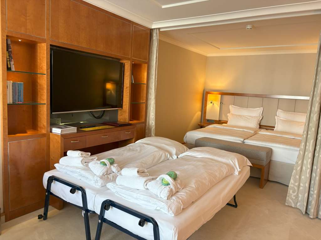 Bevor wir jedoch ins Badezimmer abbiegen, werfen wir einen Blick in den Wohn- und Schlafbereich des Zimmers. Und der ist tatsächlich etwas gewöhnungsbedürftig, denn in dem großzügig dimensionierten Wohn- und Schlafbereich mit einer Wohnlandschaft, Schreibtisch und Sessel befindet sich das Bett in einer Nische, die man mit einem Vorhang vom Rest des Zimmers abteilen kann. Dann hat man jedoch eine dunkle Nische ohne Fenster. In unserem Fall standen zwei Zustellbetten direkt vor dem Einbauschrank mit Fernseher. Auch das war etwas gewöhnungsbedürftig, denn direkt vom Zustellbett lud eine Spalte zum Hineinfallen ein. Für Kinder keine gute Lösung, die wir mit ein paar Kissen der Wohnlandschaft ausfüllten.