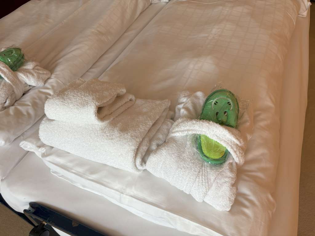 Natürlich waren alle Annehmlichkeiten wie Minibar, Safe und Bügeleisen mit Bügelbrett vorhanden. Auch Bademäntel waren vorhanden. Für die Kids sogar in Kindergrößen und mit ziemlich coolen Dinosaurier-Slippern.