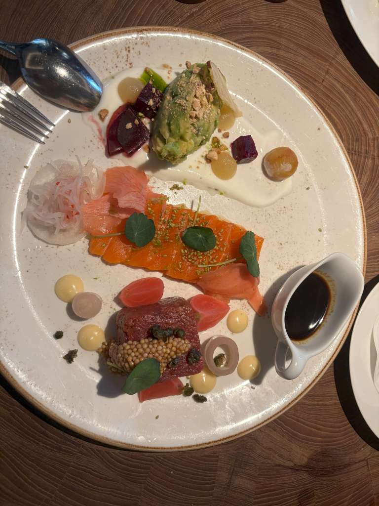 Wir hatten zuvor die Speisekarten aller Restaurants studiert und fanden das Angebot von Theo’s am passendsten für uns. Dabei hatten wir es gar nicht auf ein Entrecôte oder T-Bone-Steak abgesehen, sondern wählten eine bunte Auswahl an Vorspeisen.