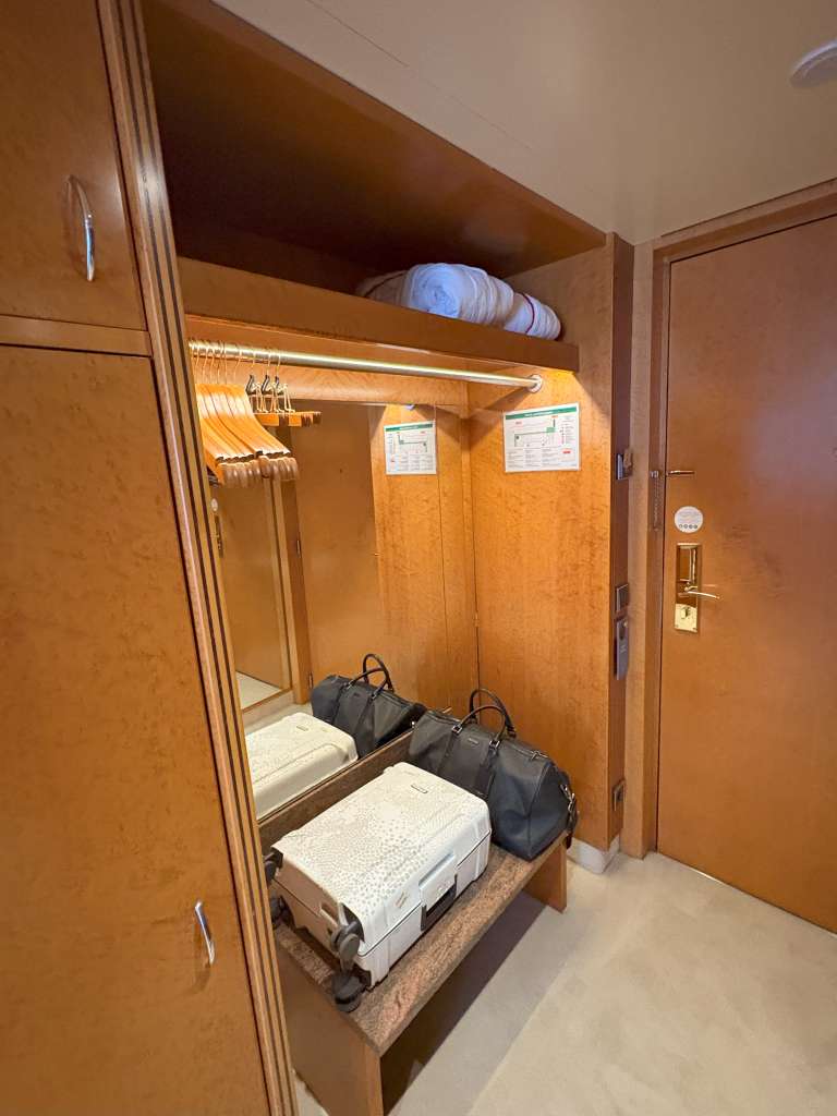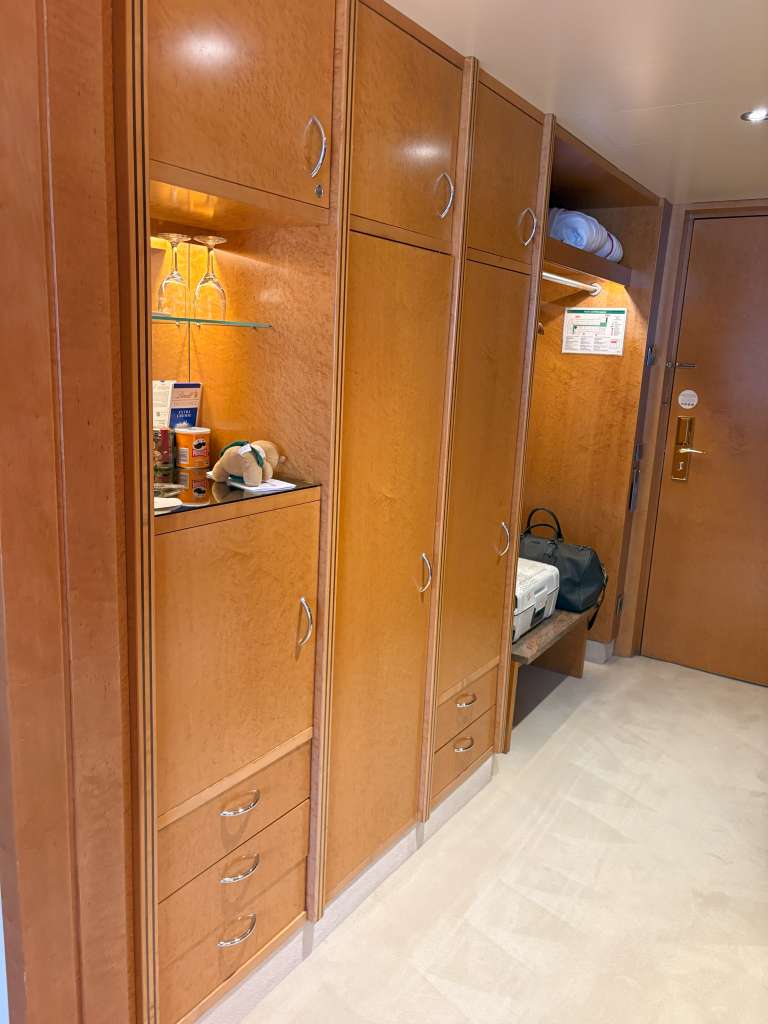 So legten auch sie die Zimmerkarte auf den Leser, um die Tür zum Alcove Room zu öffnen. Der erste Eindruck wirkte eher altmodisch mit seinem holzvertäfelten Flur und den Einbauschränken, der Garderobe und Service-Station auf der einen Seite, dem bodentiefen Spiegel auf der anderen Seite. Von hier ging auch eine Tür zum Badezimmer ab.