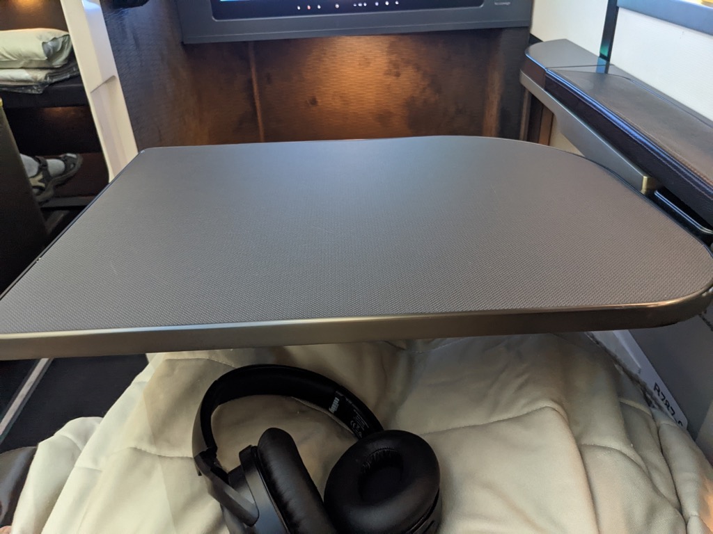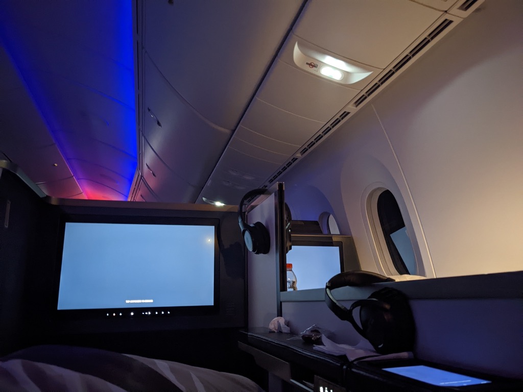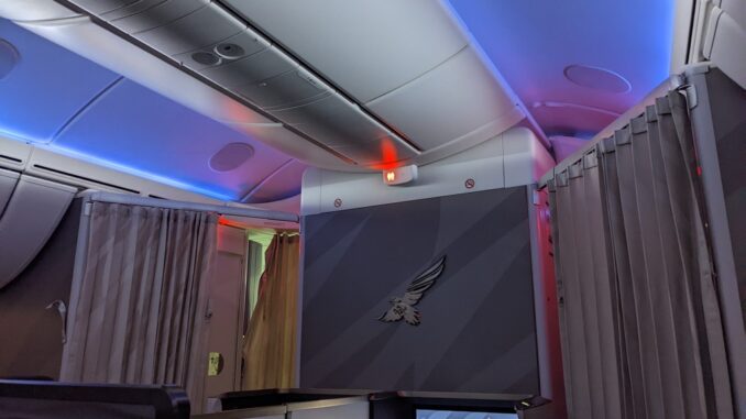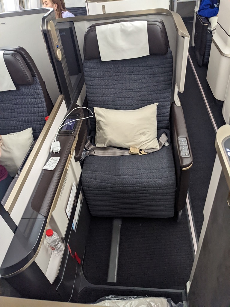 Die 26 APEX Suites sind in einer 2-2-2 Konfiguration verbaut und jeder Sitz hat einen Zugang zum Gang, aber, wer am Fenster sitzt hat nur einen schmalen Weg zum Gang. Breitere Personen werden hier potentiell Probleme haben, weswegen ich dennoch einen Gangplatz empfehle. An jedem Sitz befinden sich 2 USB 2.0 Steckplätze. Wenn Ihr einen USB-C Anschluss benötigt, habt Ihr hier leider das Nachsehen und müsst einen entsprechenden Adapter / ein entsprechendes Kabel mitbringen. Interessant ist, dass die Kopfhörer von der Crew vor Boarding eingesteckt werden – bei 3 von 4 Flügen. Das habe ich bisher nicht erlebt und bei unserem ersten Flug war ich zunächst besorgt, dass ich die Kopfhörer von der Person vor mir nutze und fragte nach. Am Sitz befindet sich ein klassischer Gurt und kein Dreipunkt Sicherheitsgurt.